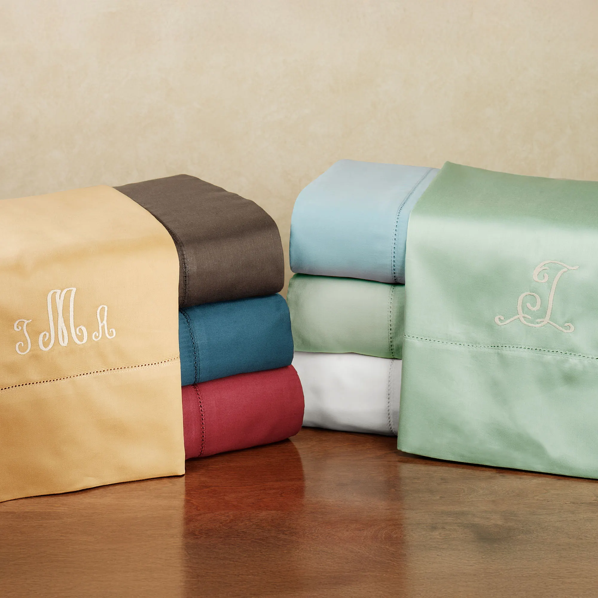 The Emerson Sheet Set is solid color, 100% cotton with a luxurious, 350 thread count. Flat sheet and pillowcase(s) have attached self hems with a decorative stitch. Fitted sheet has elastic all around and deep pockets that fit a mattress up to 17" deep. Choose Chocolate, Crimson, Dark Teal, Gold, Light Green, Sky Blue, or White. Machine wash. Imported.