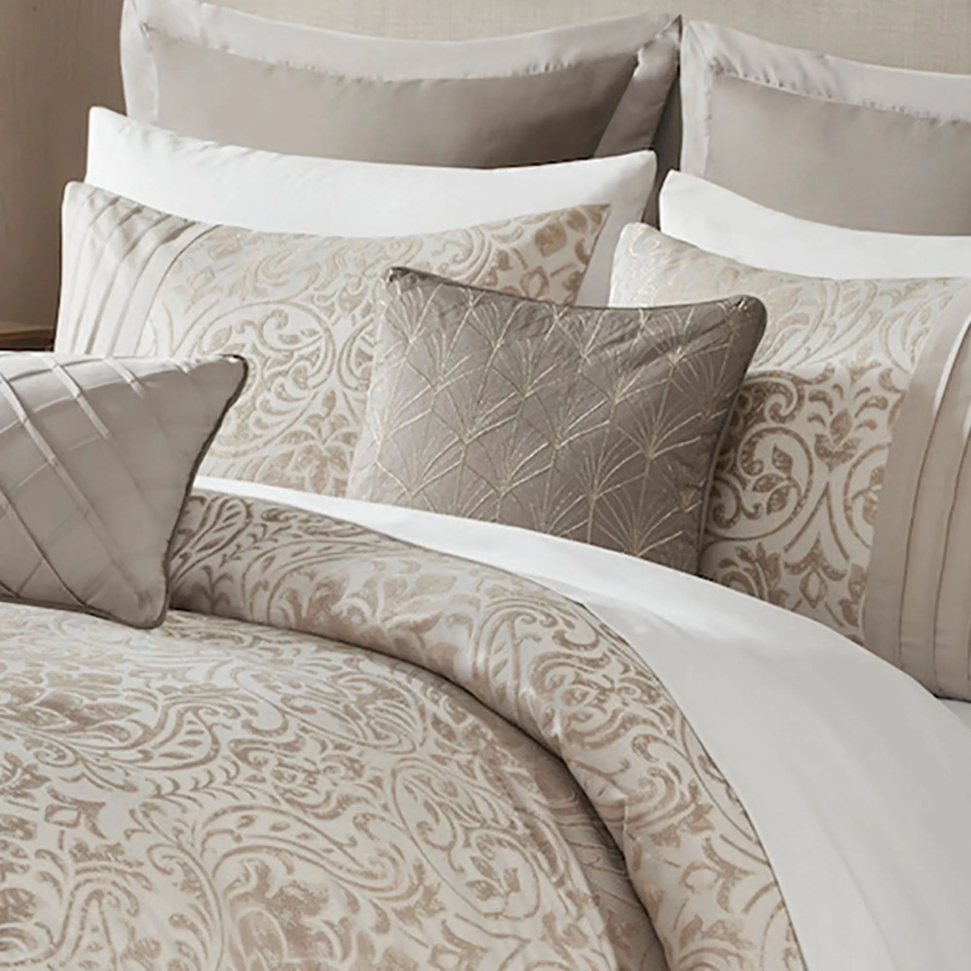 • Comforter features ornate damask in gold metallic threads