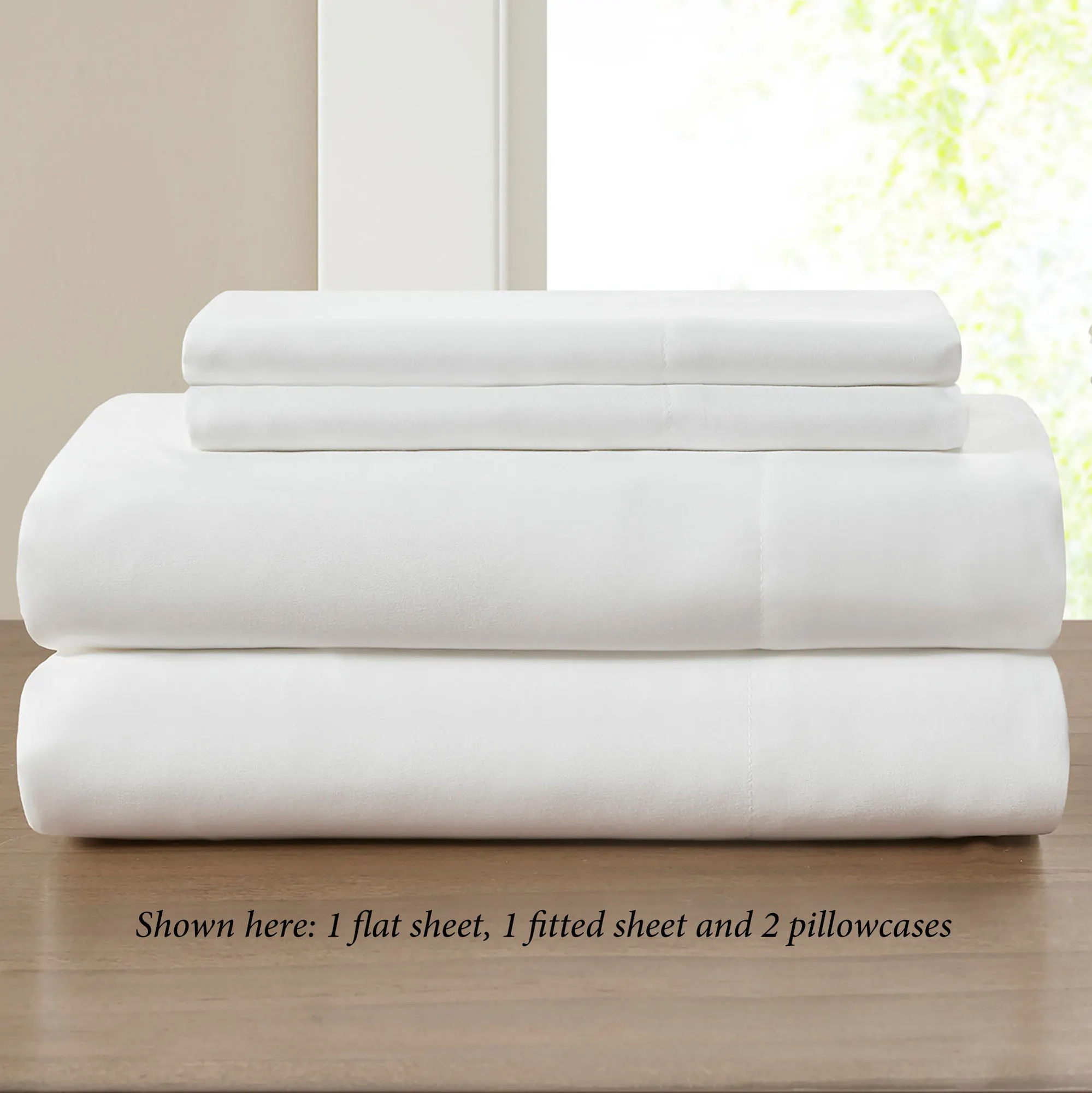 The polyester microfiber sheet set is solid eggshell. The flat sheet and pillowcases have a 4" hem. The fitted sheet has elastic all around and will fit up to a 14" deep mattress.