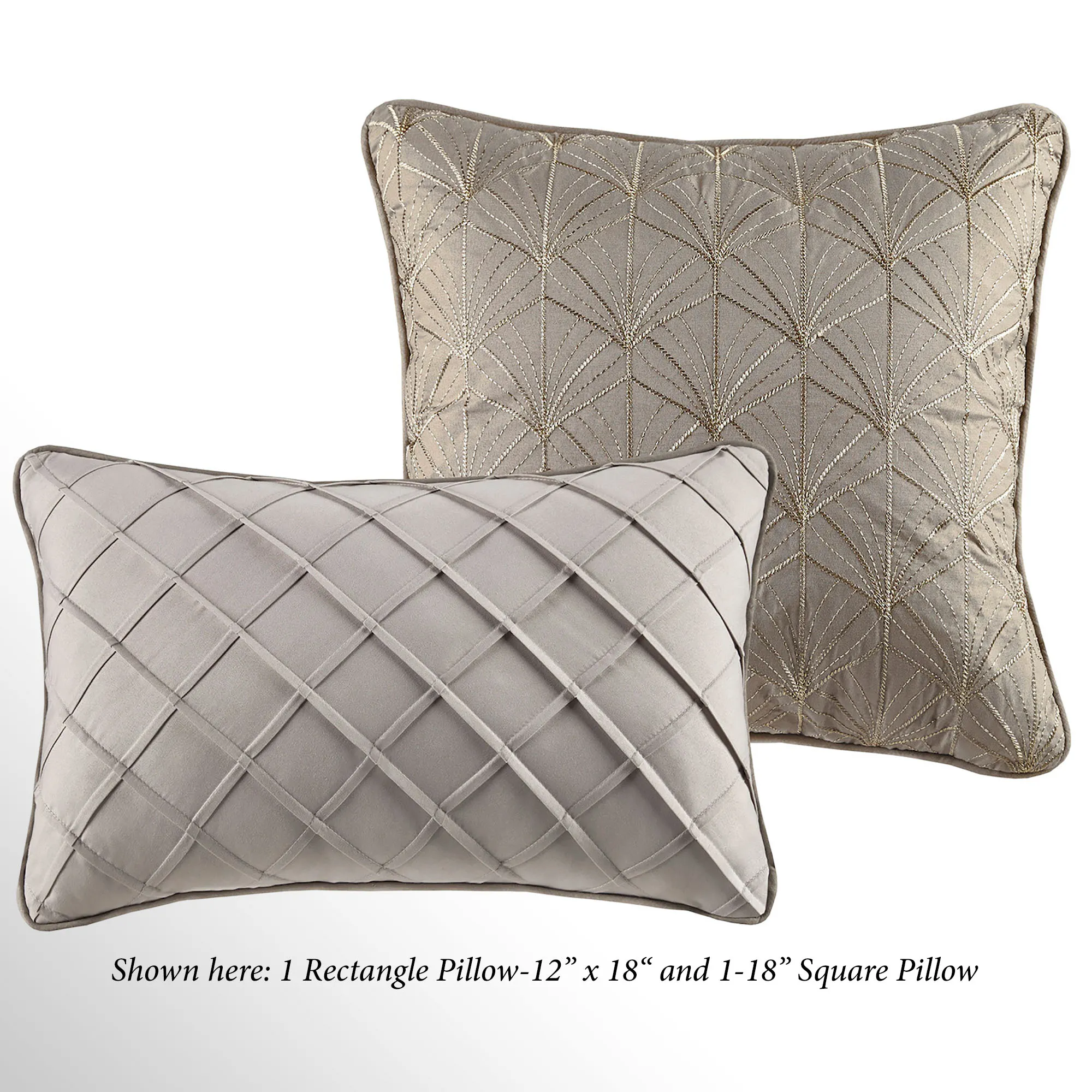 The warm beige rectangle pillow has pleats and piped ends. The piped square pillow has gold metallic embroidery on dark khaki.