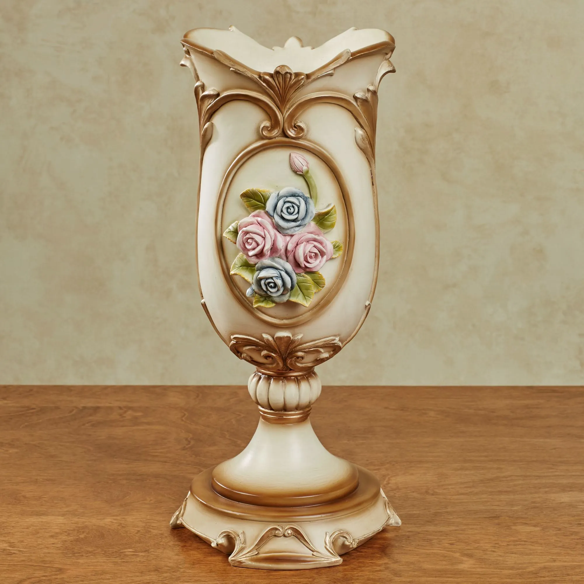 Blossoming beautifully, the pretty flowers on the Emmalynn Rose Decorative Vase flourish elegantly. Made of resin, this handpainted accent features pastel pink and blue rose clusters and swirling scrolls in tan with subtle touches of gold. Ivory vase has roses on the front and back. For decorative use only. Measures 8"dia.x16.5"H.