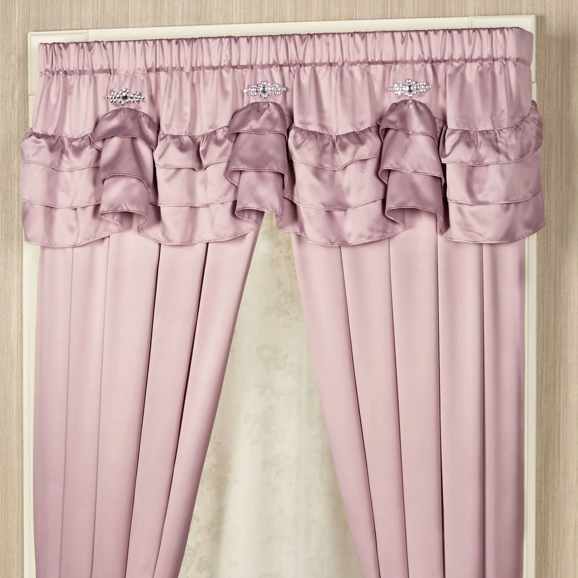 The Enchante Ruffled Window Treatment will give your room a soft, endearing accent. Window treatment is an alluring, dusty mauve, polyester satin. Scalloped Valance has three brooch detail accents and three layers of ruffles on the bottom; 3" rod pocket. Valance measures 72"Wx18"L. Machine wash. Imported.