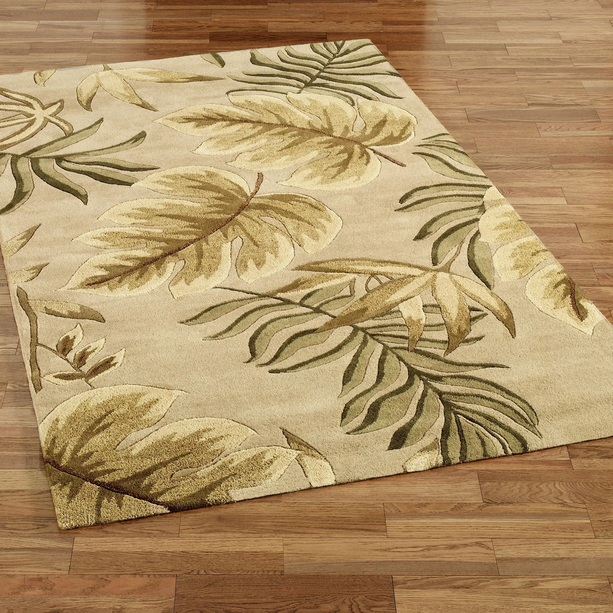 Let the tropical foliage on the Enchanted Leaves Area Rugs create an island sensation in your home. Multi-textured wool area rugs, .625" thick, have hard twist accents. Tropical rugs include the warm colors of beige-taupe, shades of green, gold, camel, and light brown. Hand-tufted in India. We recommend professional cleaning by a rug cleaner.