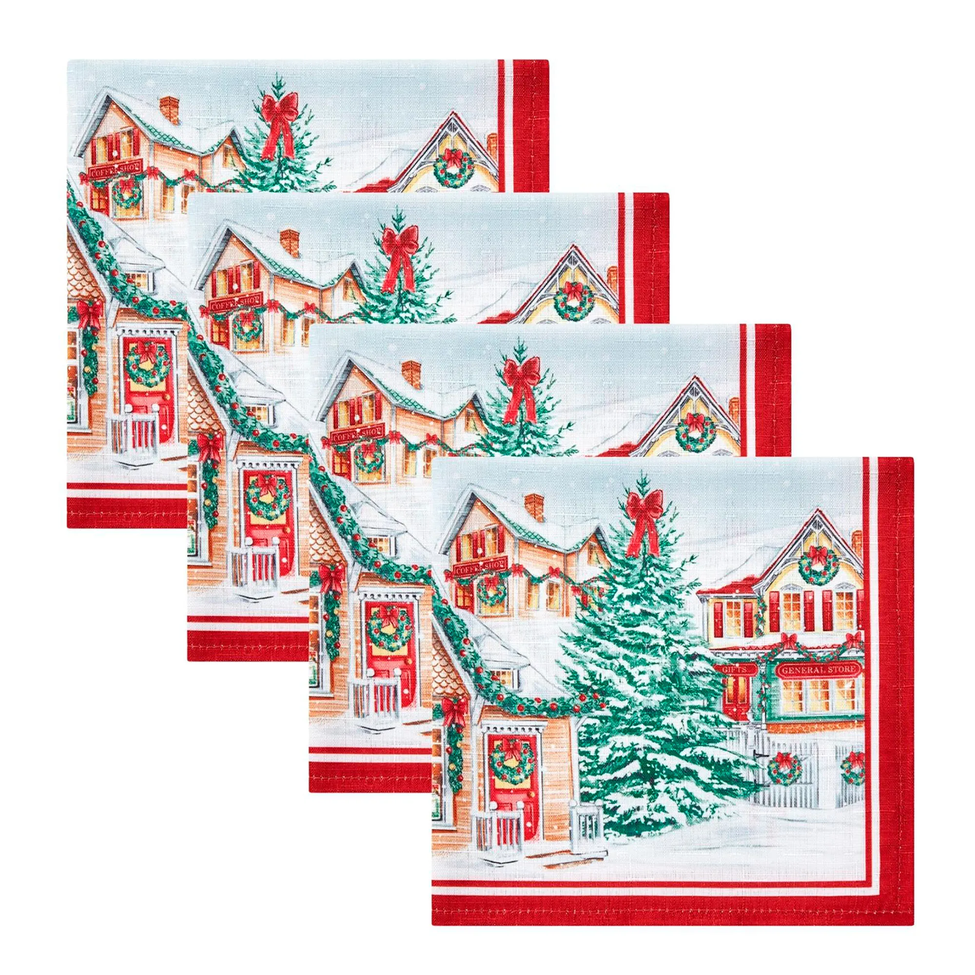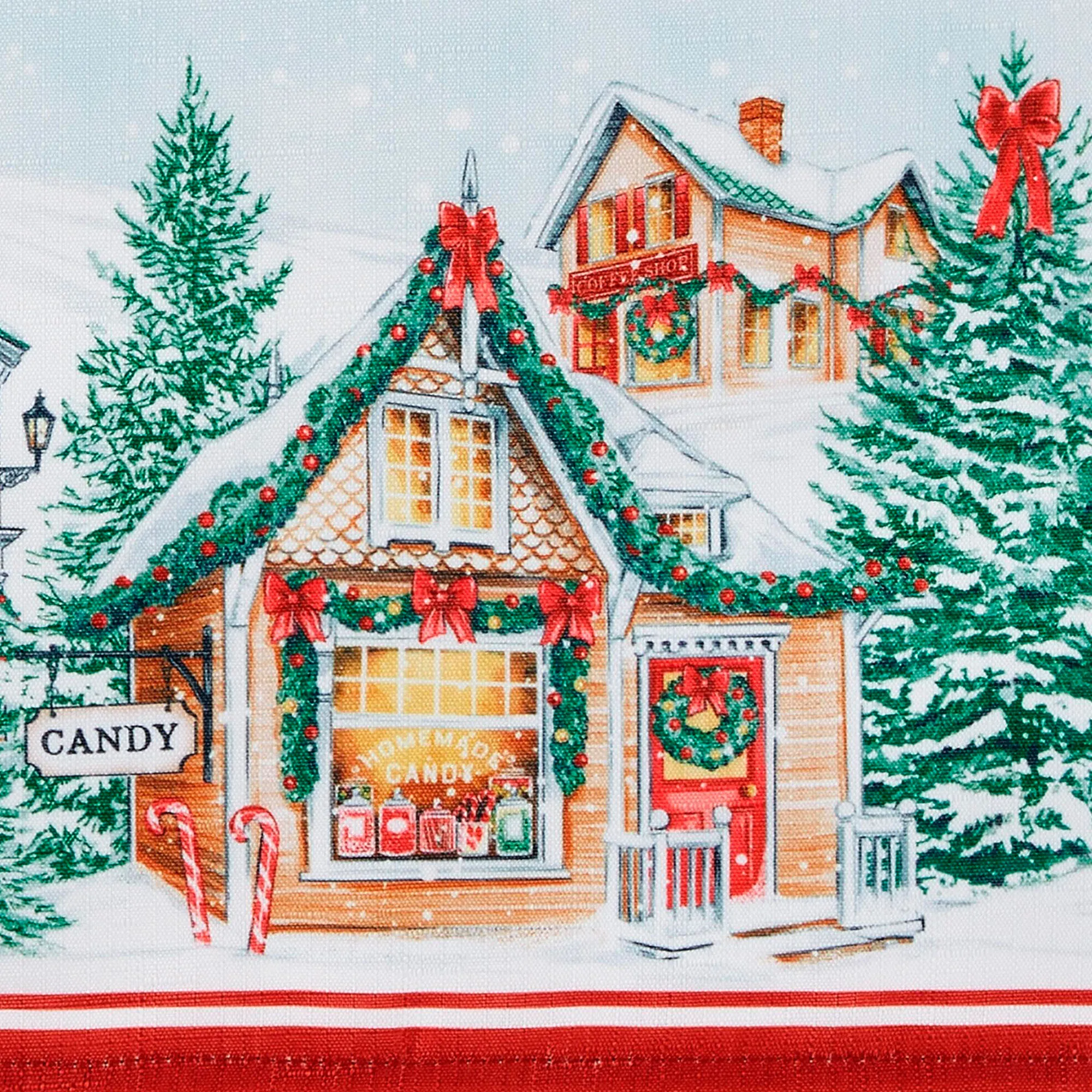 Make a reservation for your holiday dinner at the Enchanted Noel village and take in the perfect Christmas decorations and winter charm. Accented with red double stripes, these tailored off-white printed polyester table linens feature a quaint snow-laden town festooned with pine garland, red bows, ornaments, wreaths, and candy canes. Snowflakes decorate the background for more winter whimsy. Choose Round Tablecloth, Rectangle Tablecloth, Oval Tablecloth, Table Runner, Placemat Set of 4, or Napkin Set of 4. Machine washable. Imported.