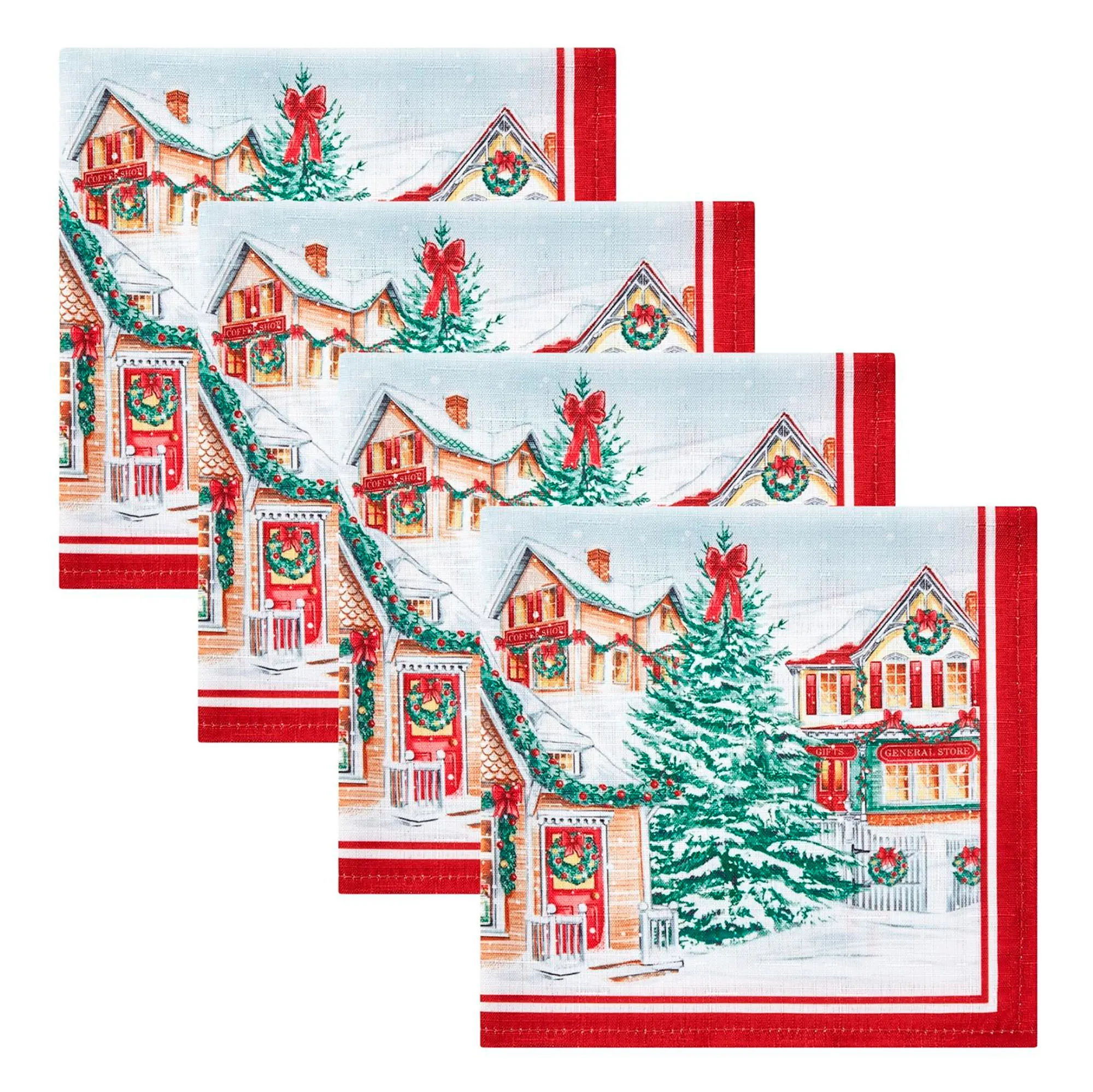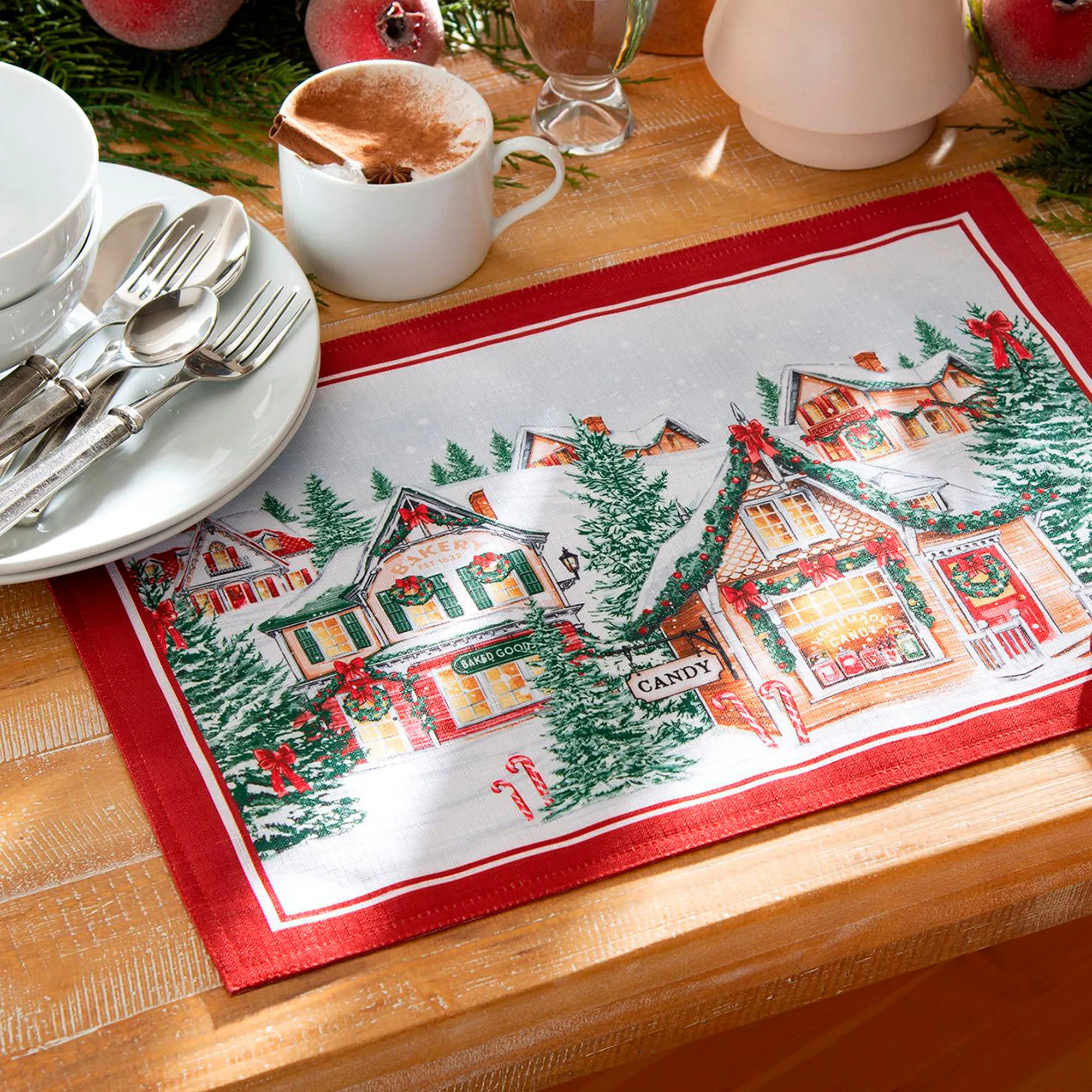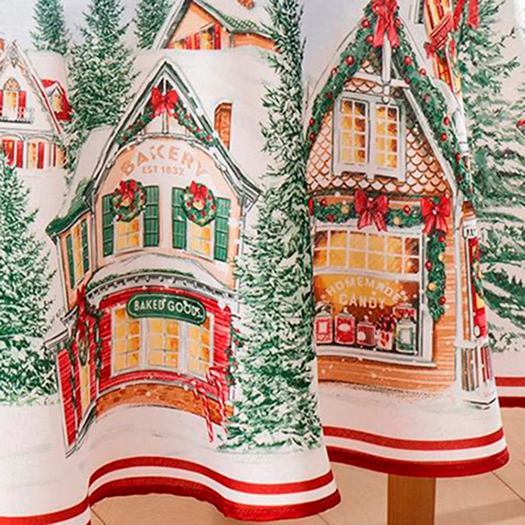 Make a reservation for your holiday dinner at the Enchanted Noel village and take in the perfect Christmas decorations and winter charm. Accented with red double stripes, these tailored off-white printed polyester table linens feature a quaint snow-laden town festooned with pine garland, red bows, ornaments, wreaths, and candy canes. Snowflakes decorate the background for more winter whimsy. Choose Table Runner, Rectangle Tablecloth, Round Tablecloth, Oval Tablecloth, Placemat Set of 4, or Napkin Set of 4. Machine washable. Imported.