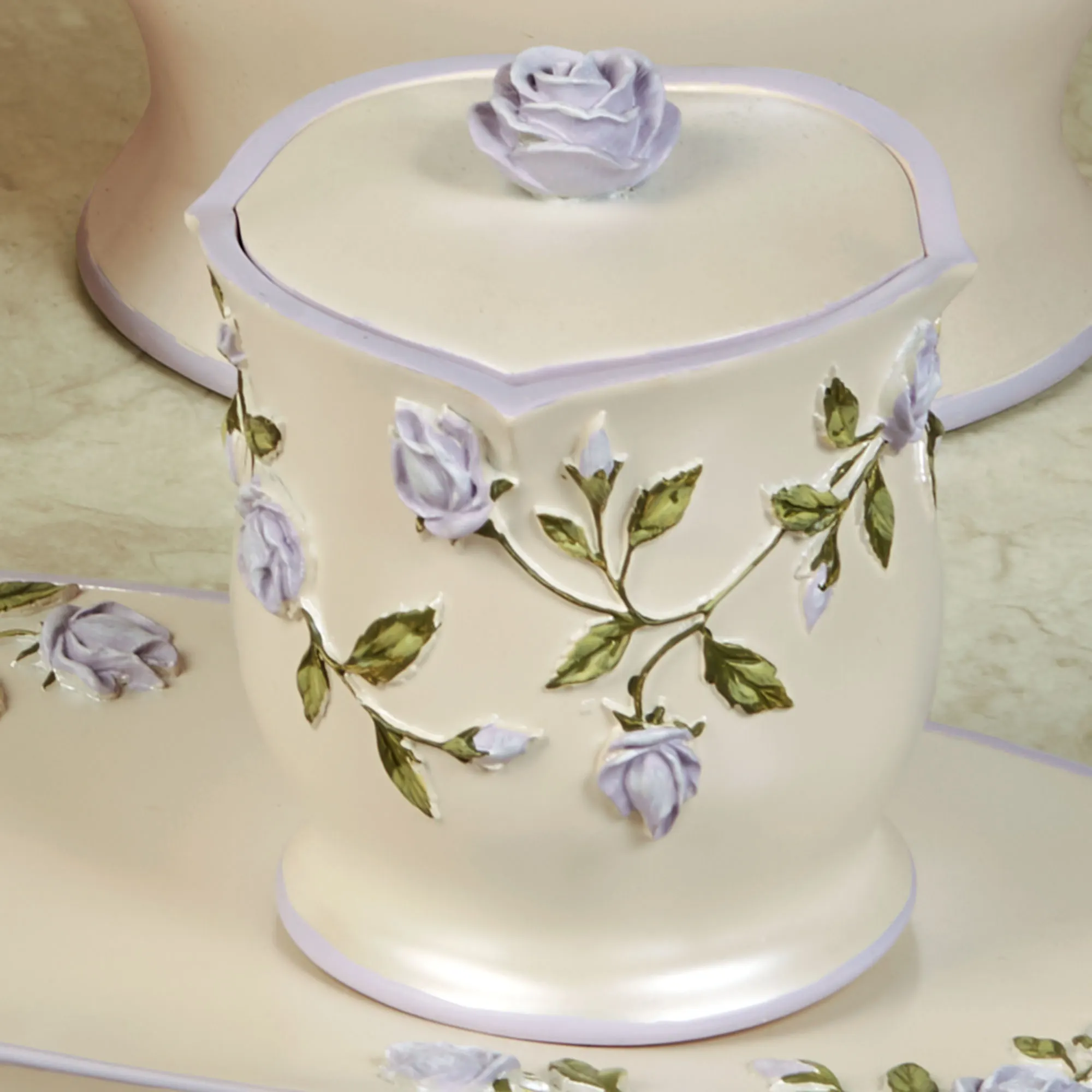 Sweetly enhance any bath space with the beauty of Enchanted Rose blooms. Accented with lavender trim, these pearlescent resin floral bath accessories feature handpainted dimensional roses and trailing vines across the stylized shape. The Covered Jar has a rose on the removable lid. Specify Covered Jar, Lotion/Soap Dispenser, Tissue Cover, Tray, or Wastebasket.