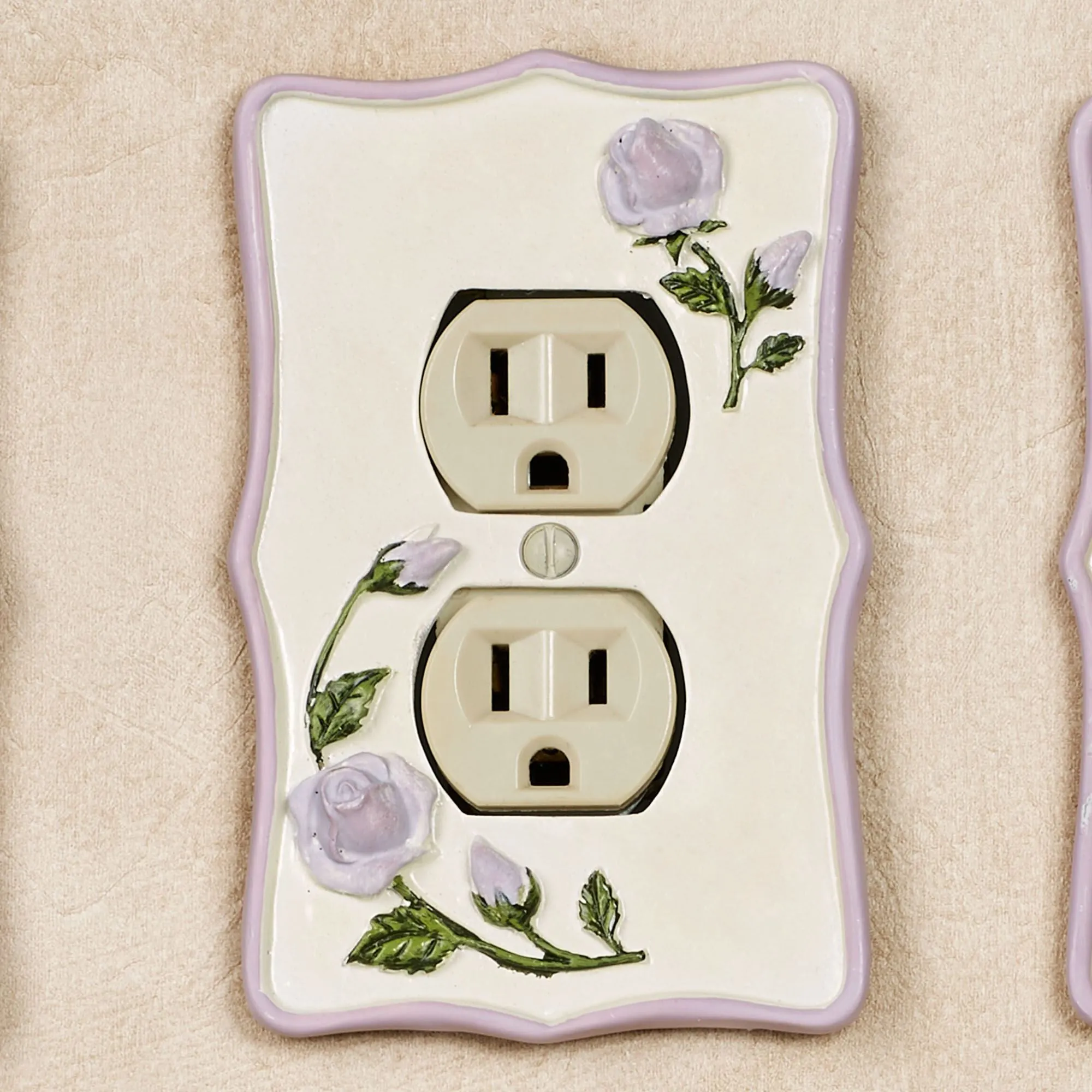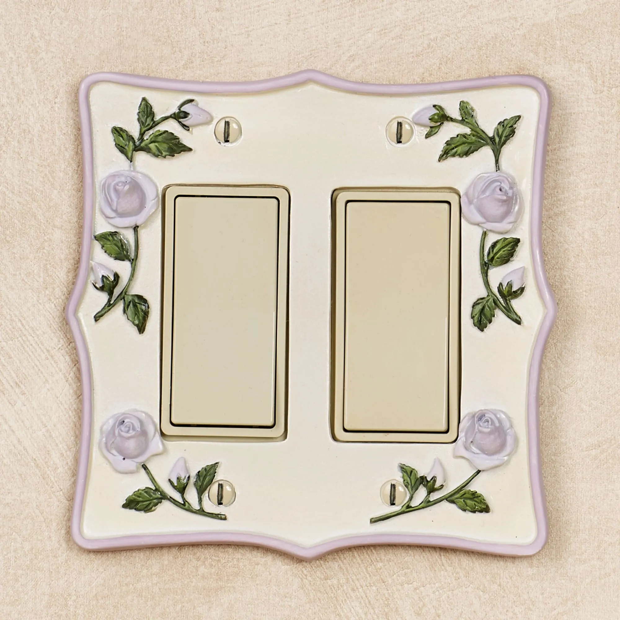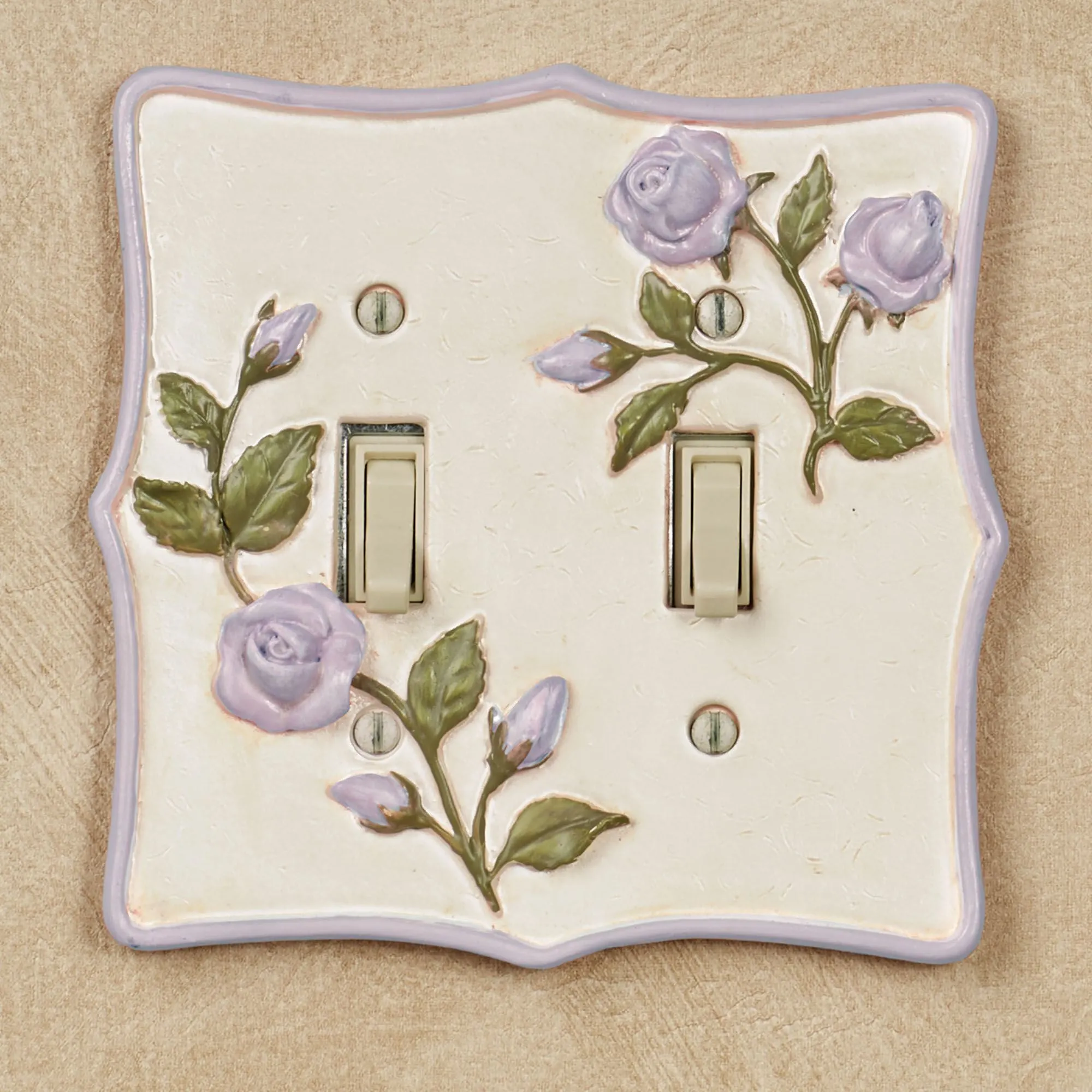Sweetly enhance any space with the beauty of Enchanted Rose blooms. Accented with lavender trim, each stylized resin switchplate features handpainted dimensional lavender rose blooms and trailing green vines on a pearlescent background. Each measures 5.25"H. Single Switch, Single Dimmer/Rocker, and Single Outlet measure 3.5"W each. Double Switch and Double Dimmer/Rocker are 5.25"W each. Single Outlet has two sockets. Specify Single Switch, Double Switch, Single Outlet, Single Dimmer/Rocker, or Double Dimmer/Rocker. Do not over-tighten screws.