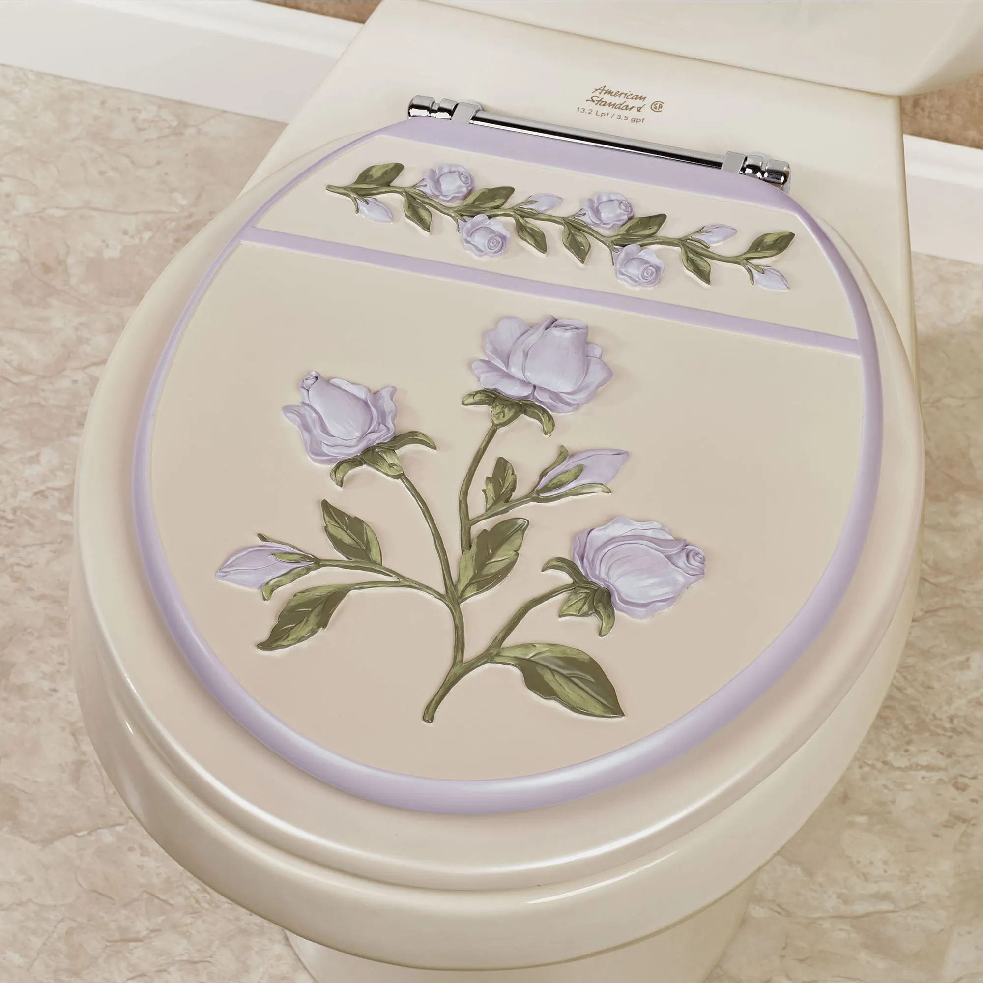 Sweetly enhance any bath space with the beauty of Enchanted Rose blooms. This standard toilet seat is pearlescent resin. Accented with lavender trim, the lid is decorated with handpainted dimensional roses and trailing vines. Rust-resistant metal hinges have a chrome-plated finish. Bolt hole distance is approx. 5.5". Standard toilet seat measures 15"x16" and weighs 10 lbs. Clean with a soft, damp cloth using mild detergent. Do not use abrasive cleaners.