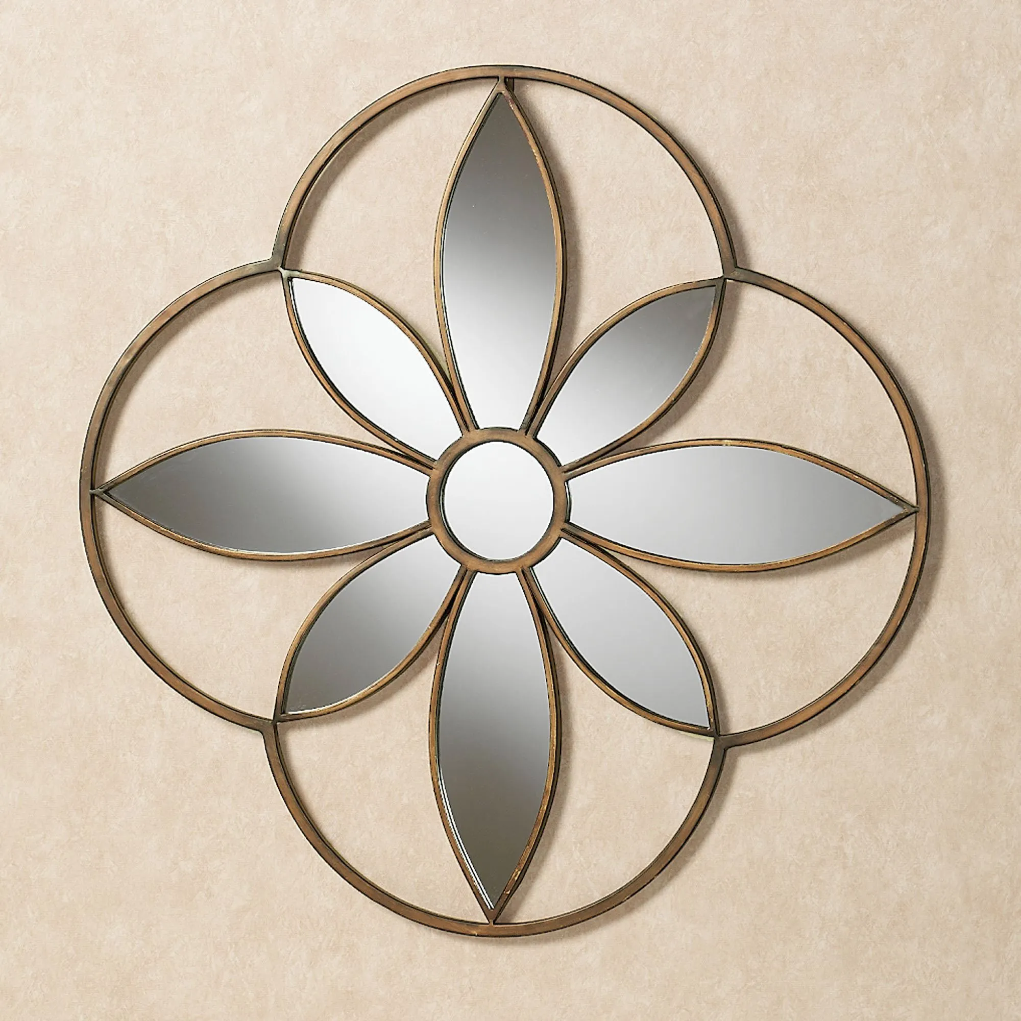 Floral accent meets stylish contemporary design in the Enchanting Bloom Mirrored Metal Wall Art. Nine individual mirror panels form the center and petals of a stylized blossom, accented with an openwork frame that is finished in antique gold. Simple, modern design makes this metal wall art a great addition to many rooms. Measures 33"x33".