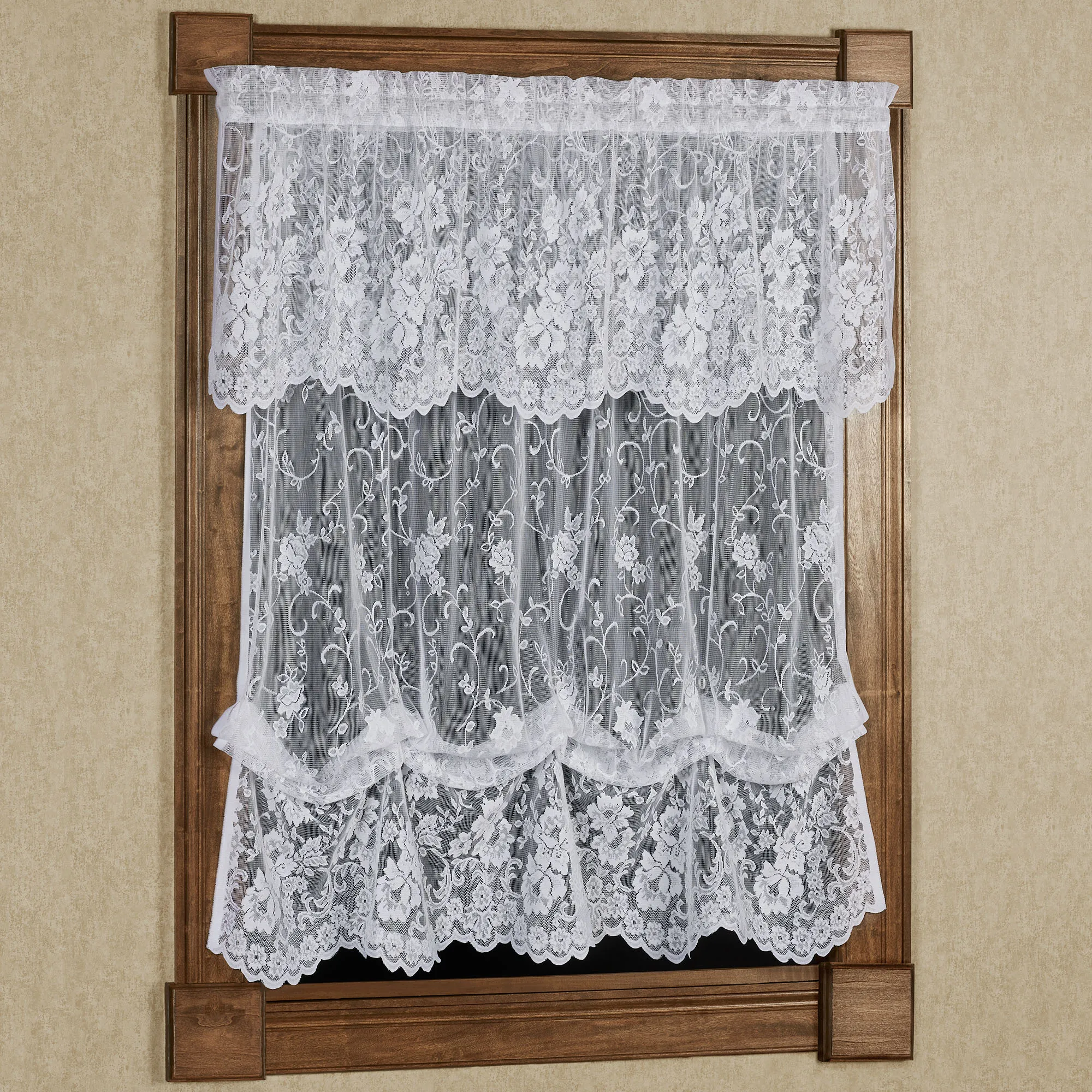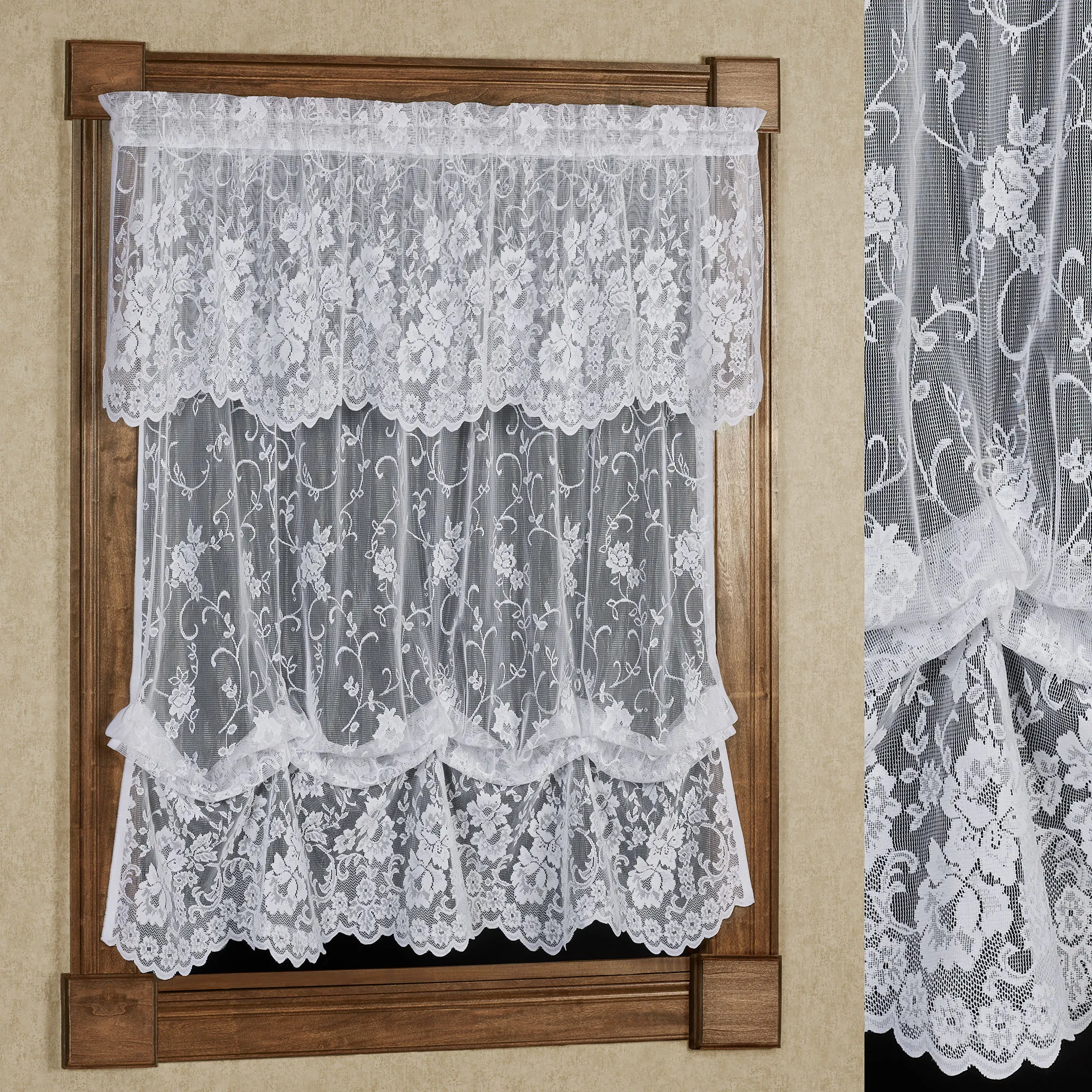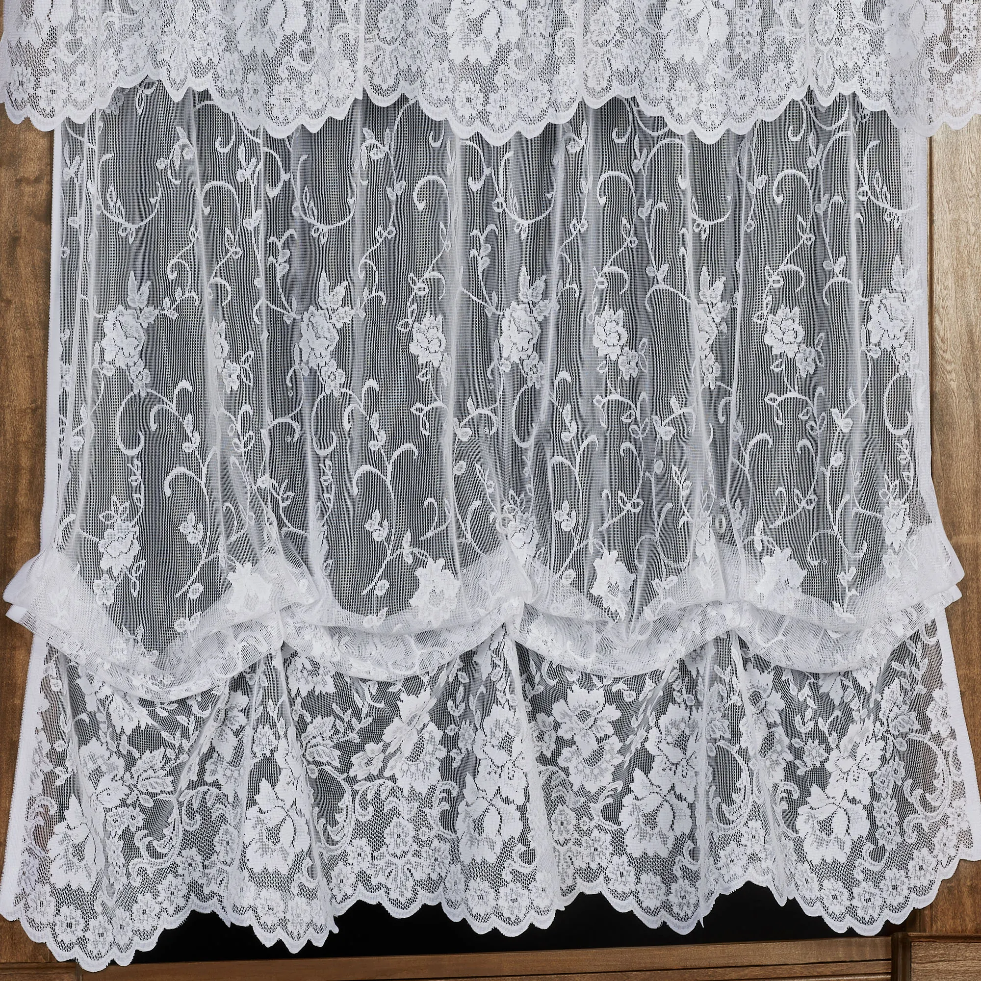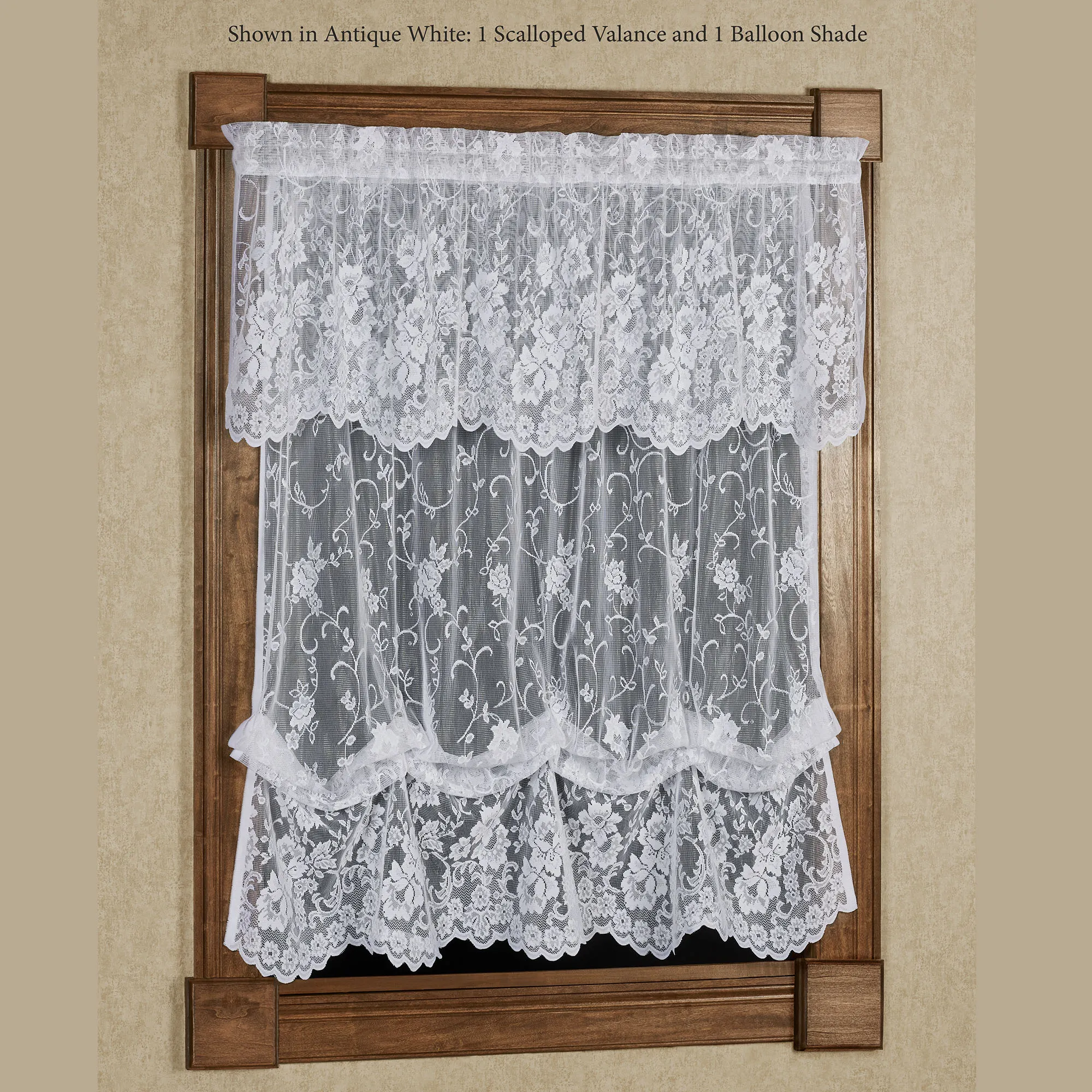 Enchanting Roses blossom and vine along this darling lace window treatment. Finished with hand-cut scalloped edges, each polyester window accent features an intricate lace pattern blooming with abundant roses. Rod pocket measures 1.5". Specify Balloon Shade, 56"Wx63"L; or Scalloped Valance, 56"Wx18"L. Balloon Shade is adjustable. Machine washable. Imported.