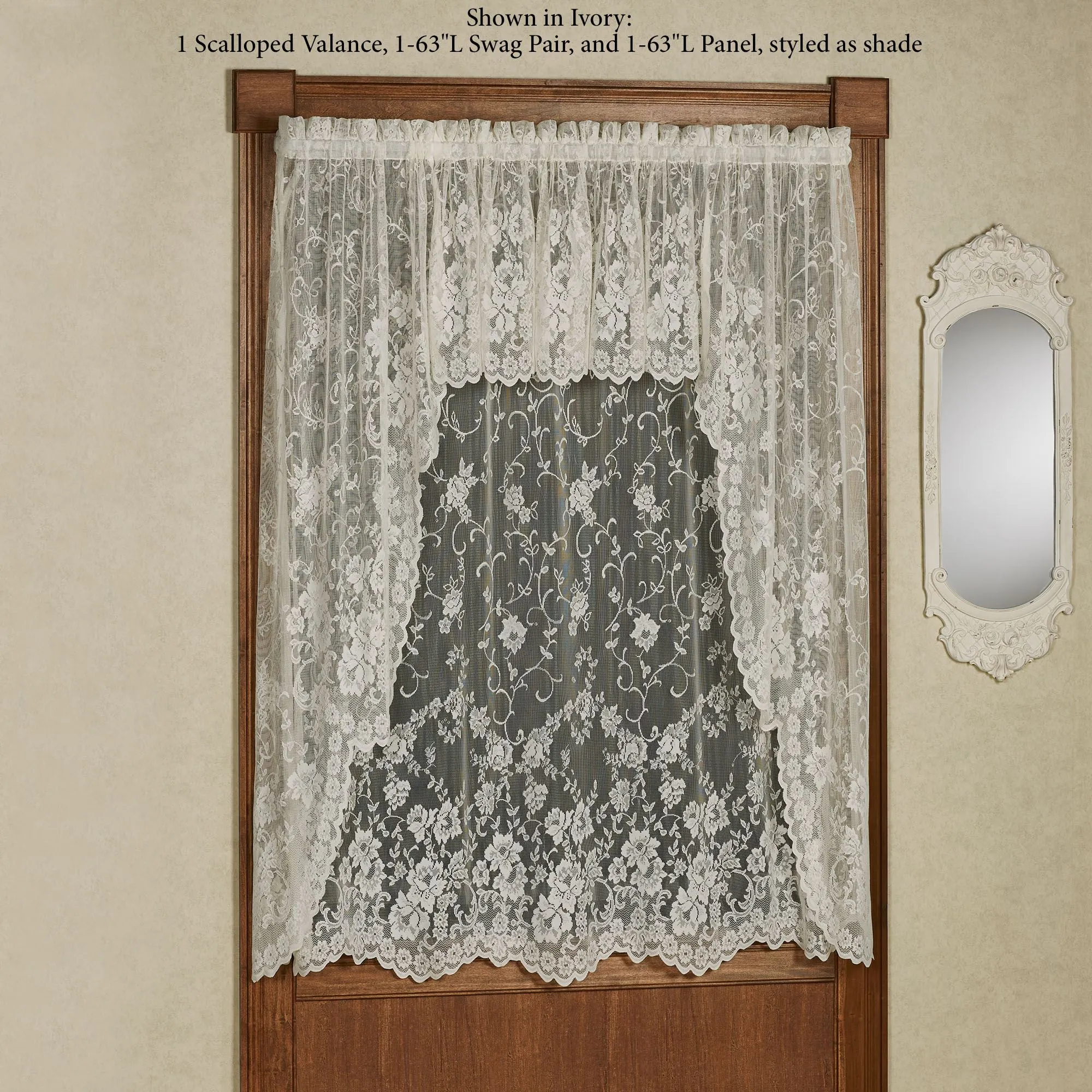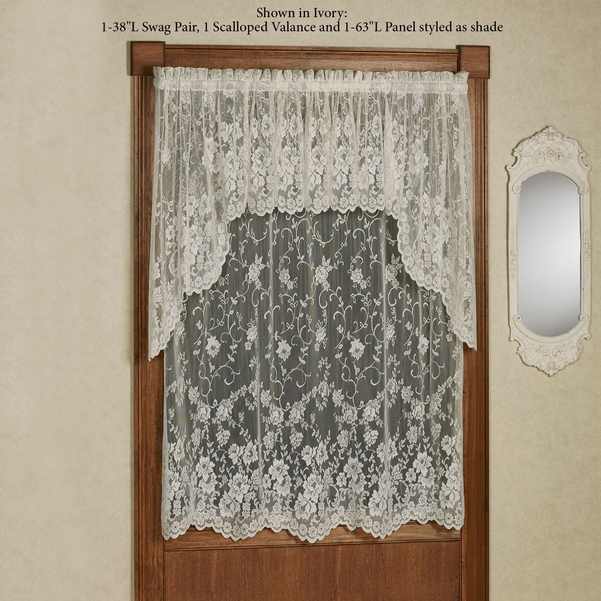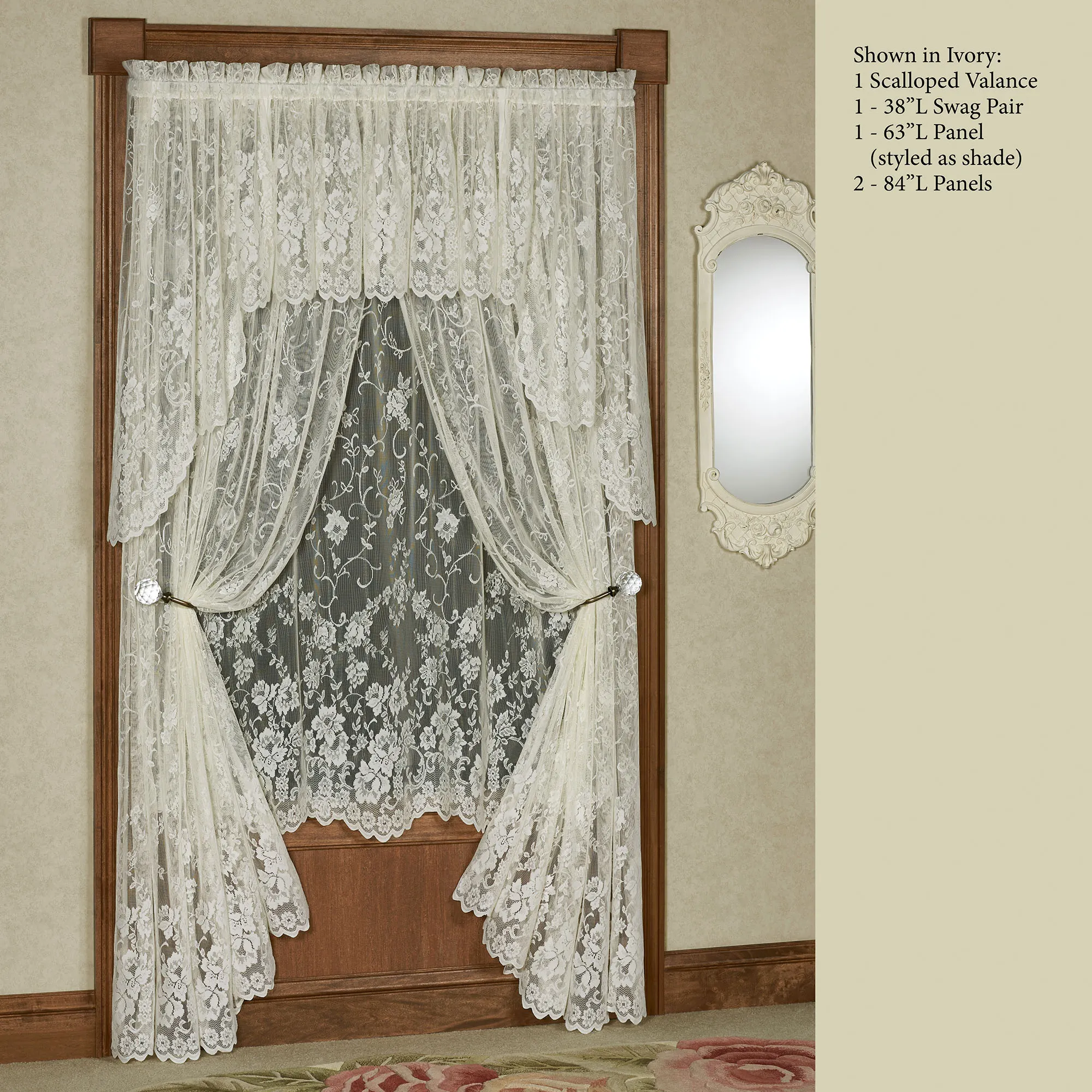 Enchanting Roses blossom and vine along this darling lace window treatment. Finished with hand-cut scalloped edges, each polyester window accent features an intricate lace pattern blooming with abundant roses. Rod pocket measures 1.5". Each measures 56"W. Specify Curtain Panel, Swag Valance Pair, Scalloped Valance, or Balloon Shade. Machine washable. Imported. See the Sizes tab for entire measurements.