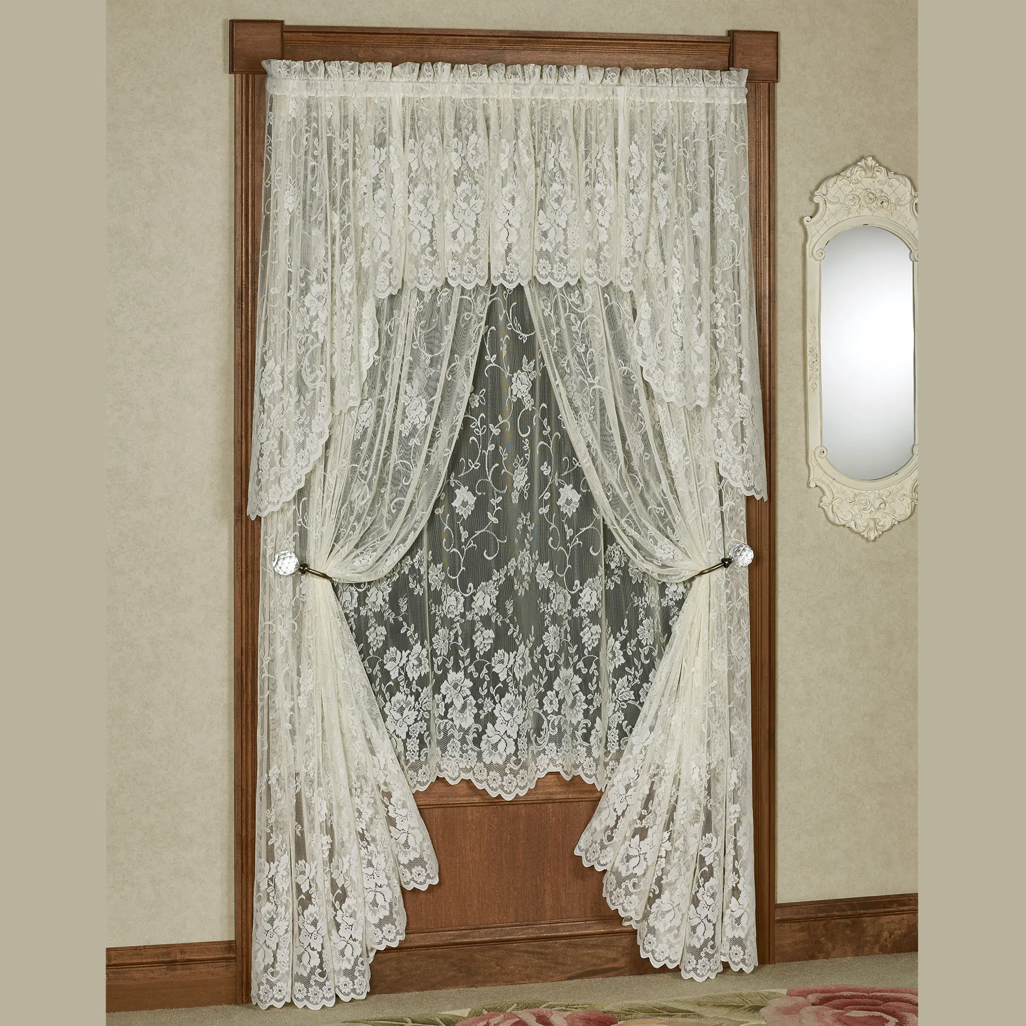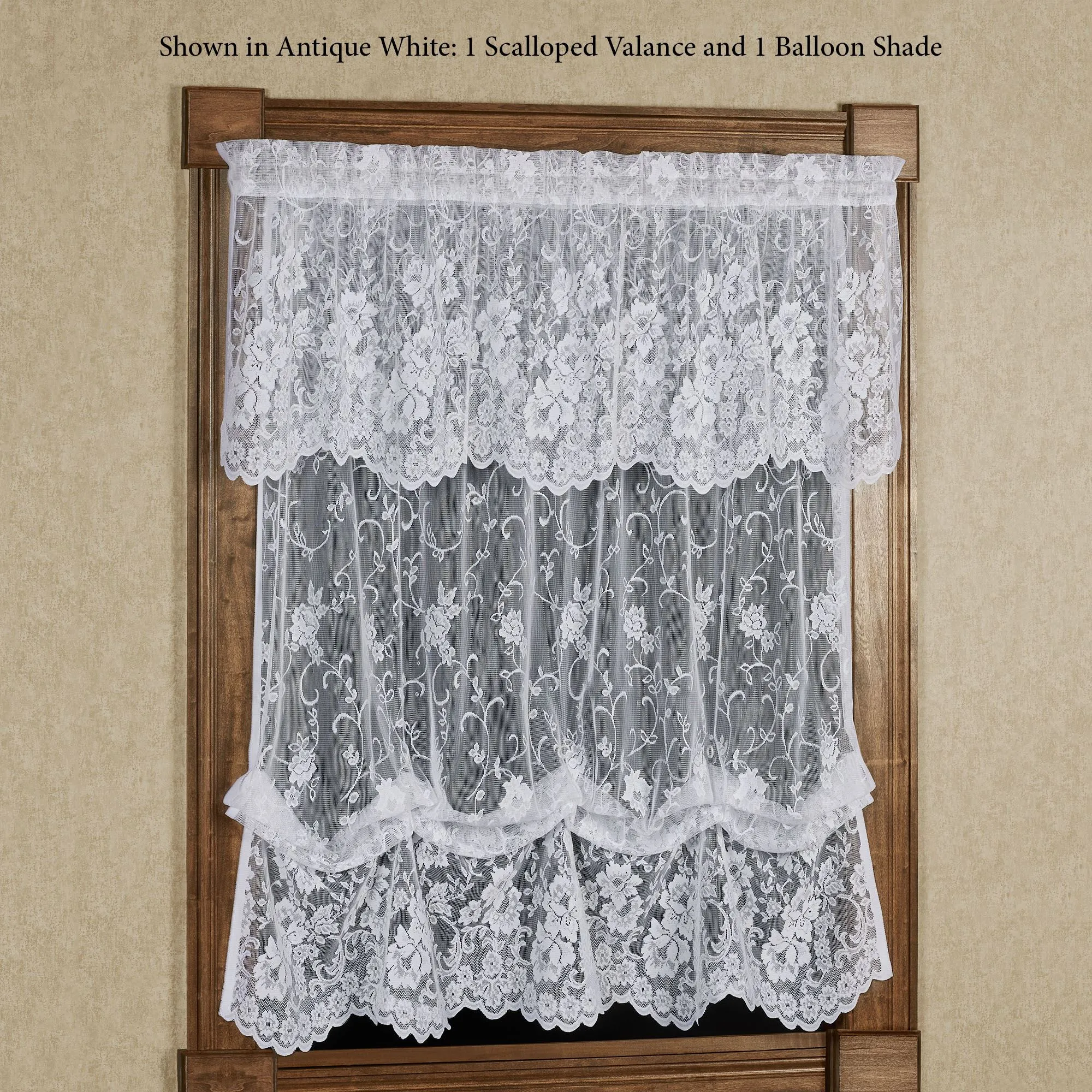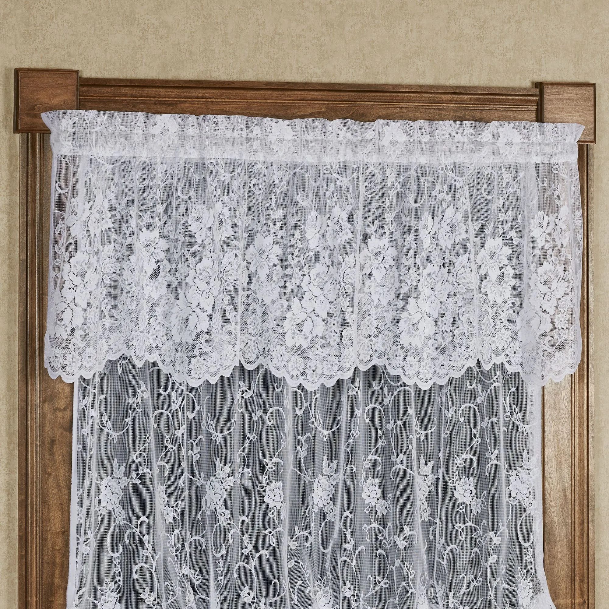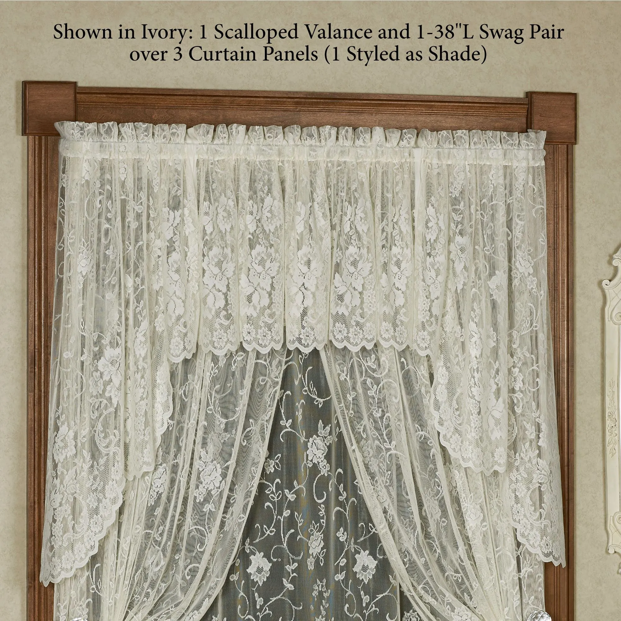Enchanting Roses blossom and vine along this darling lace window treatment. Finished with hand-cut scalloped edges, each polyester window accent features an intricate lace pattern blooming with abundant roses. Rod pocket measures 1.5". Each measures 56"W. Specify Curtain Panel, Swag Valance Pair, Scalloped Valance, or Balloon Shade. Machine washable. Imported. See the Sizes tab for entire measurements.