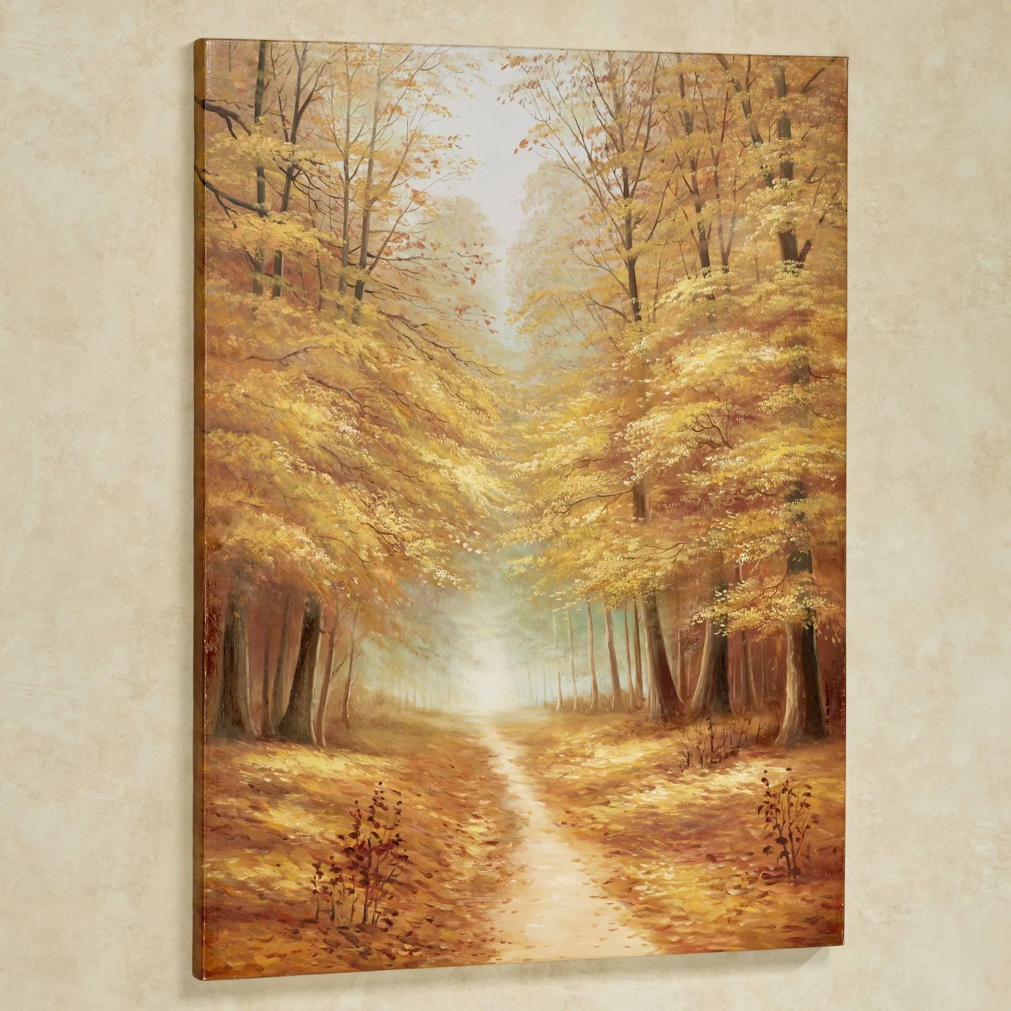 The End of Fall must certainly be coming near as the trees' brilliant foliage falls from every bough. The handpainted oil canvas contains a shadowed trail cutting through the woods, its path cleared of crisp golden yellow and soft brown leaves. Canvas is gallery-wrapped over a wood frame. Due to the handpainted nature of this item, minor variations may occur. Fall wall art measures 30"Wx1.5"Dx40"H.