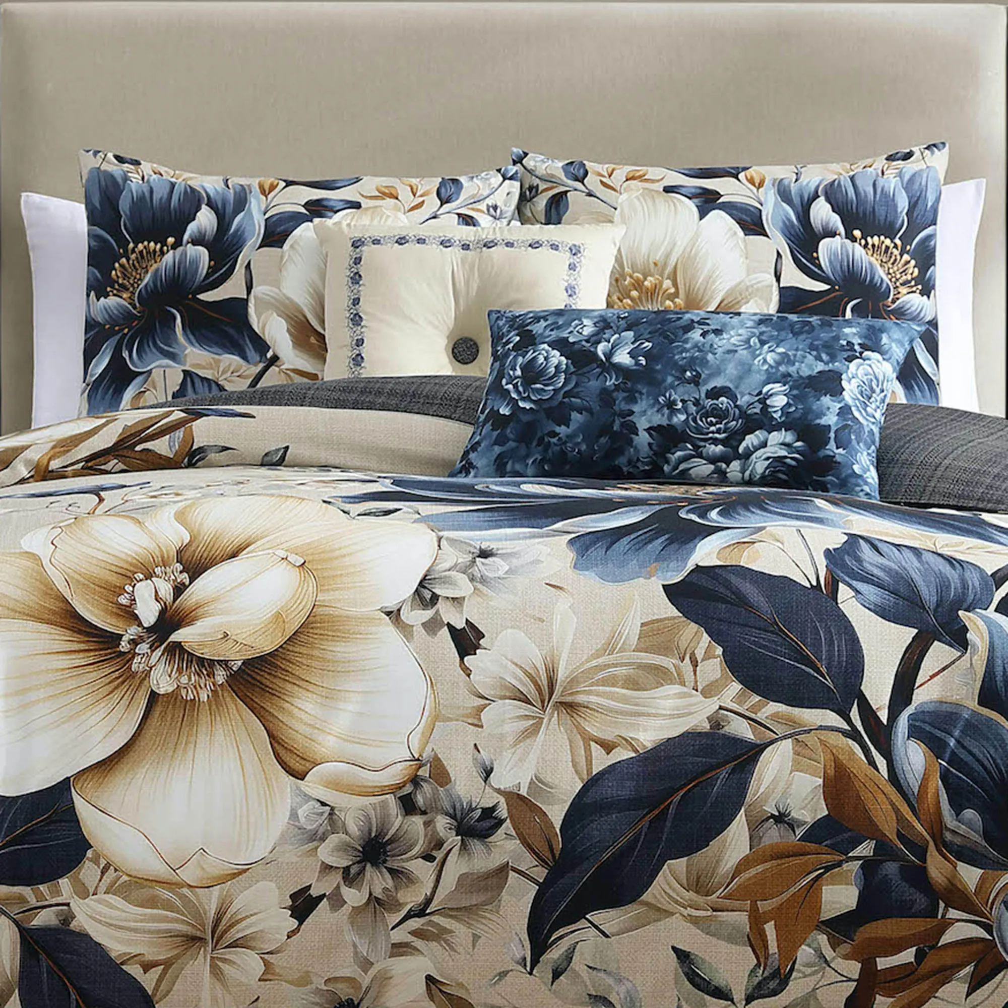 Drift away to dreams of magnificent blossoms growing with abandon at your English Manor. The 5-piece Bed Set includes a floral comforter, 2 shams, and 2 accent pillows. Blue, golden brown, and ivory flower blossoms fill the beige cotton sateen bedding with printed floral wonder. Oversized comforter reverses to blue and ivory plaid. Click on the Details tab to read about the other items. Fill is polyester. Machine washable; spot clean the pillows. Imported.