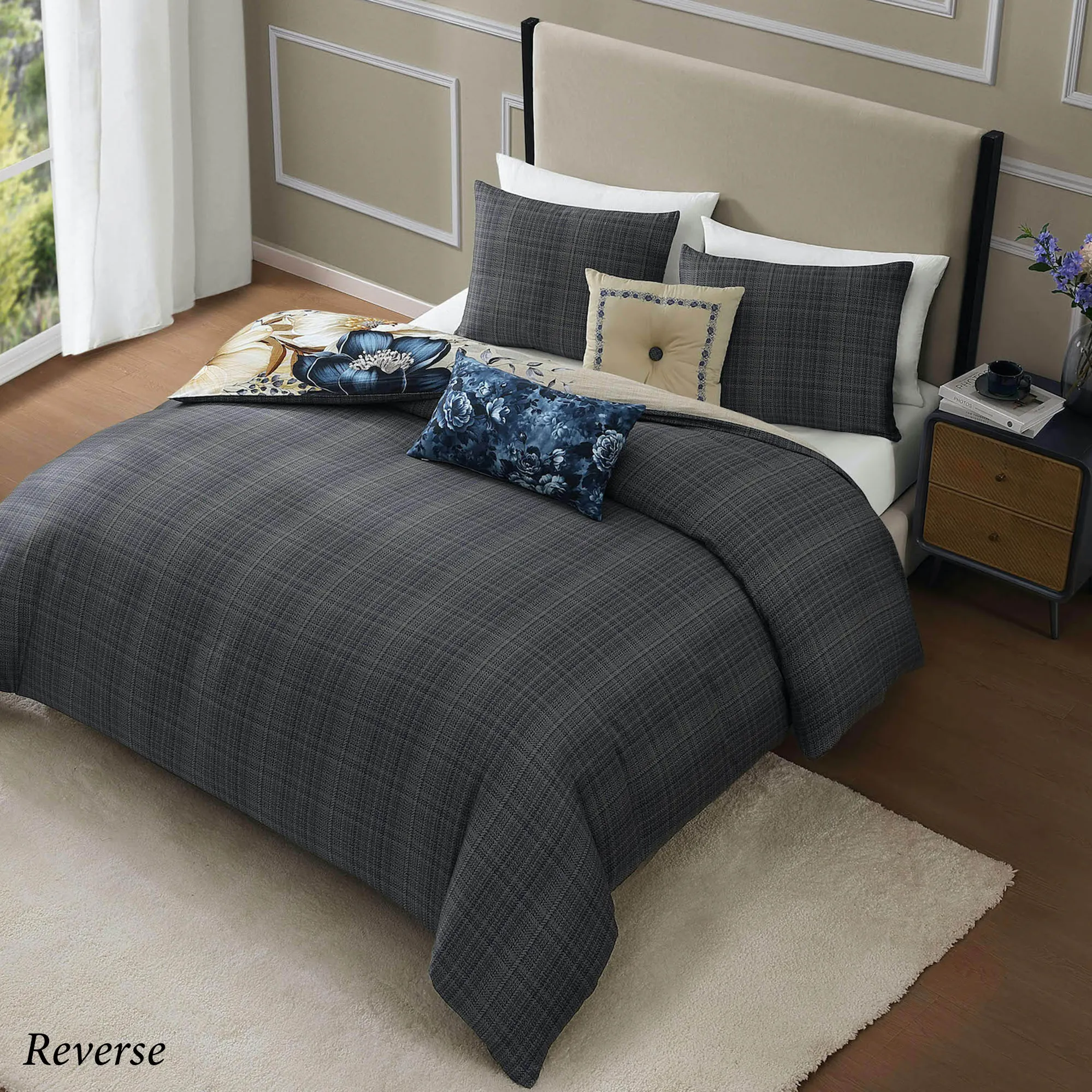 • Comforter and shams reverse to blue and ivory plaid
