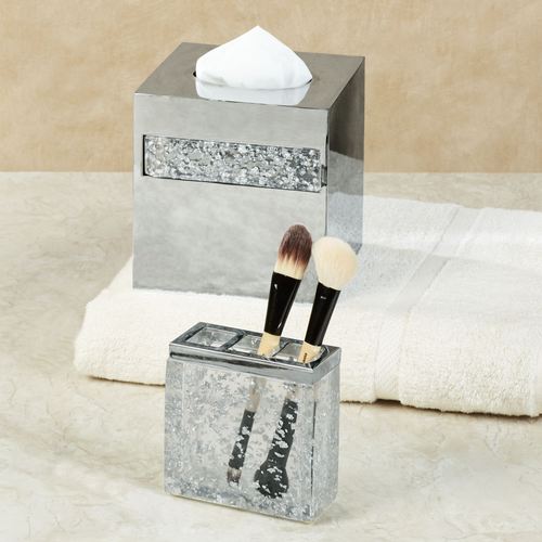 Dazzling silver metallic accents Enlighten your bath area with elegance. Made of metal, these silver bath accessories have clear resin sections accented with foil flakes. The Brush Holder can be used to hold your toothbrushes or makeup brushes. Choose Tissue Cover, 6"sq.x6"H; or Brush Holder, 4"Wx2"Dx4"H.