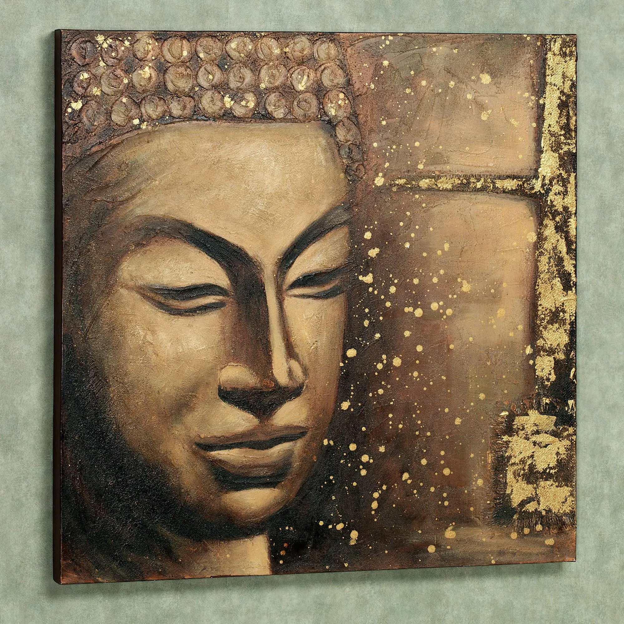 The Enlightener Canvas Art features a close-up image of Buddha's face. This tranquil study is done primarily in shades of brown with textured embellishments and gold highlights. The oil on canvas artwork is gallery-wrapped over a wooden frame. Due to the handpainted nature of this item, minor variations may occur. Buddha canvas wall art measures 32" sq.