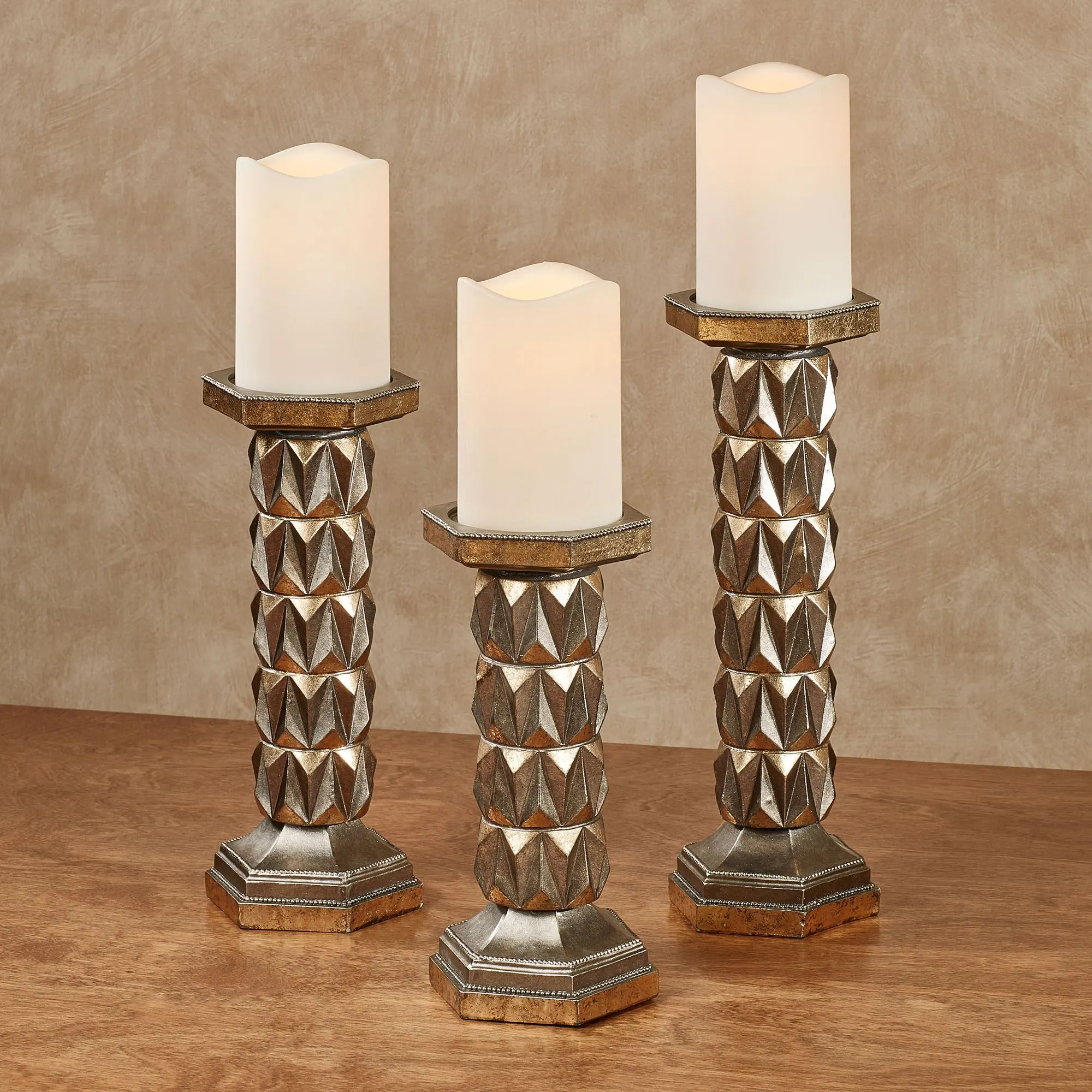 Prismatic shapes fill the dynamic Enrico Candleholder Set. Finished in burnished gold, each resin candleholder features a stepped hexagonal base, beaded detailing, and unique triangular designs beneath your 3" dia. candle. Candleholders measure 4.5"Wx4"Dx9"-12"H.