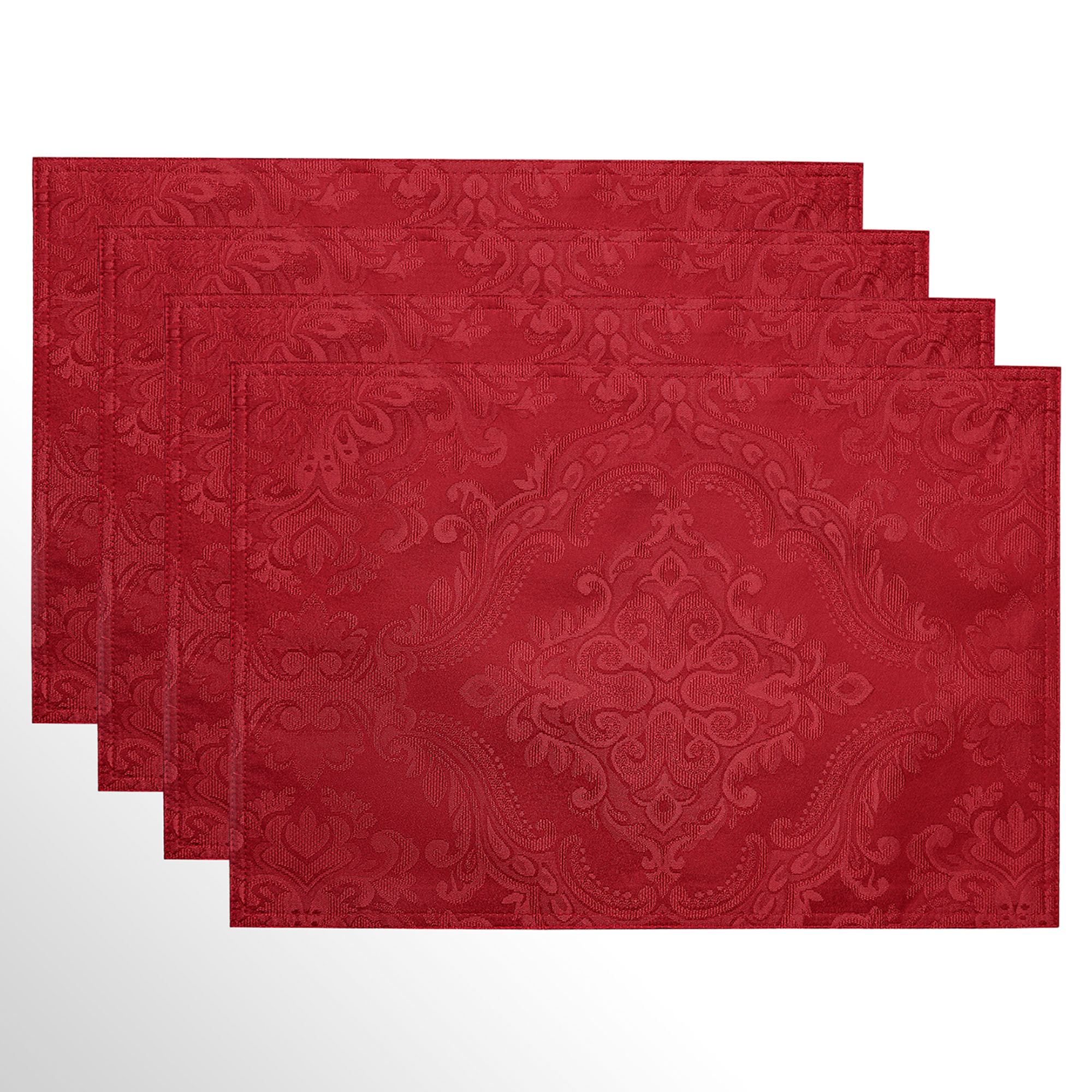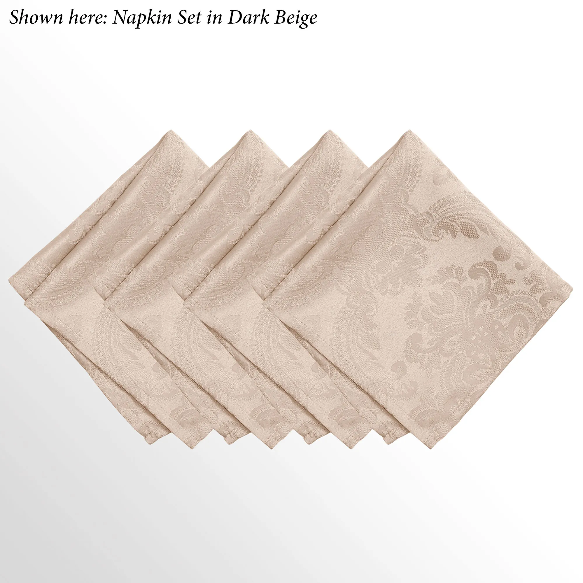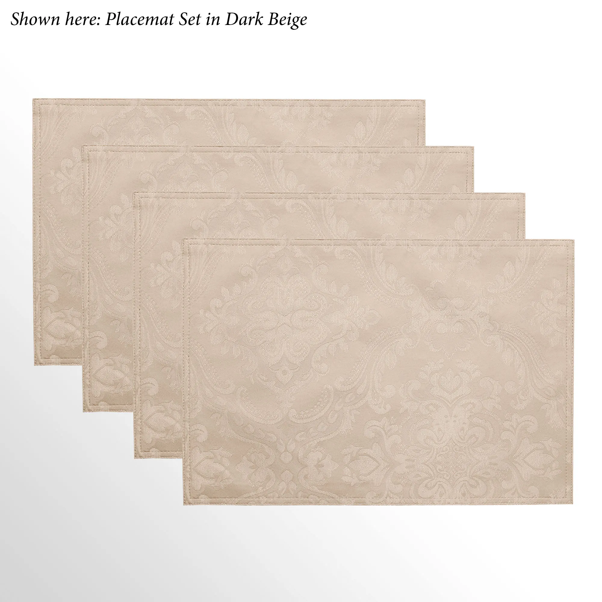 Grace your tablescape with the timeless wonder of the Ensley Table Linens. In a rich solid color, each polyester accent features jacquard-woven damask designs with tailored edges. Embellished with the subtle distinctive texture, the fabric designs protect your furnishing by resisting stains, repelling water, and resisting fading. Specify Dark Beige, Burgundy, Gold, Ivory, Red, Silver, or White. Wipe clean with a damp cloth or machine wash. Imported.