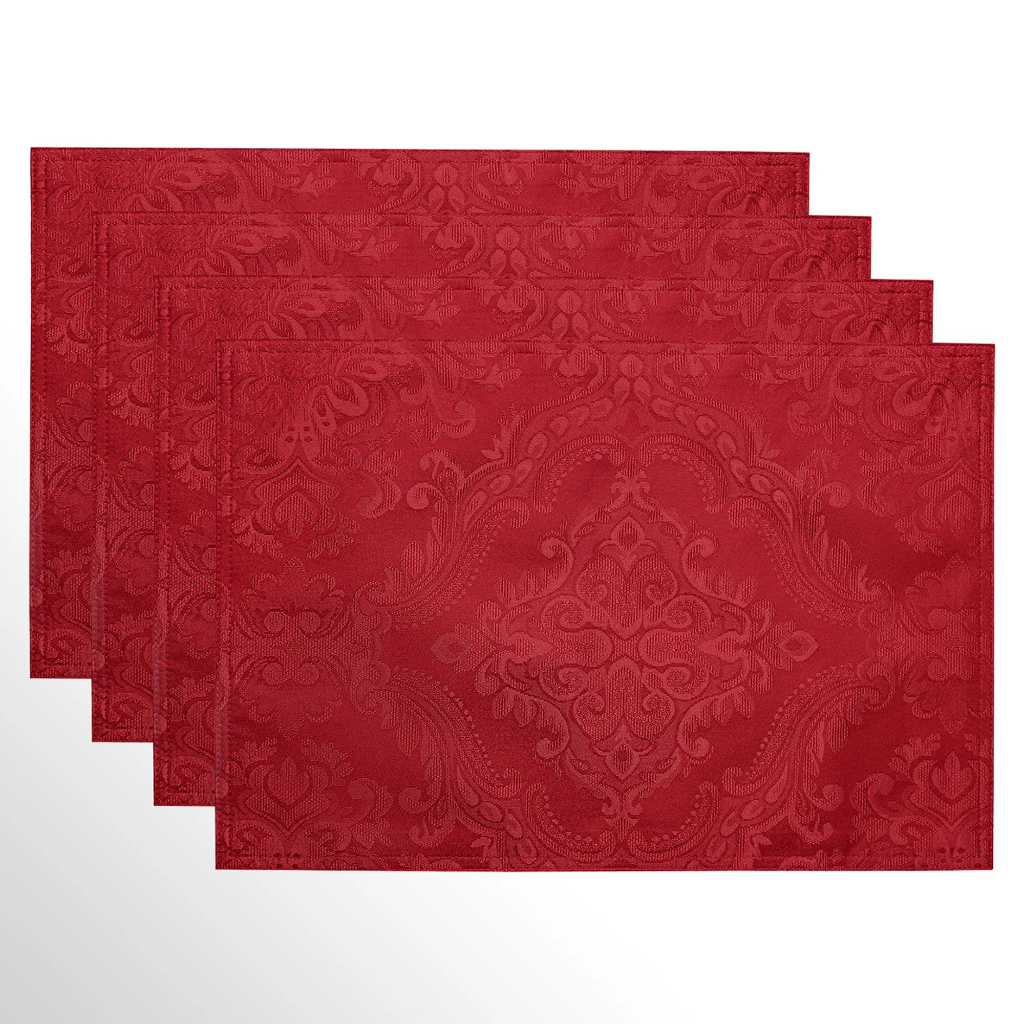 Grace your tablescape with the timeless wonder of the Ensley Table Linens. In a rich solid color, each polyester accent features jacquard-woven damask designs with tailored edges. Embellished with the subtle distinctive texture, the fabric designs protect your furnishing by resisting stains, repelling water, and resisting fading. Specify Burgundy, Dark Beige, Gold, Ivory, Red, Silver, or White. Wipe clean with a damp cloth or machine wash. Imported.