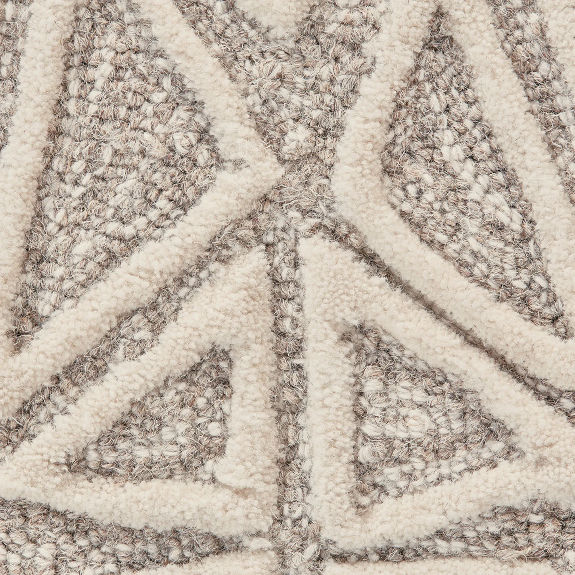 Abstract style and global inspiration converge within the Enzo Area Rug. Hand-tufted in India, the .31" thick, pure wool rug features abstract triangular geometrics that form unique band designs. A hi-low texture adds intrigue throughout with a mottled taupe background and ivory motifs. Backing is cloth-covered latex. We recommend professional cleaning by a rug cleaner.