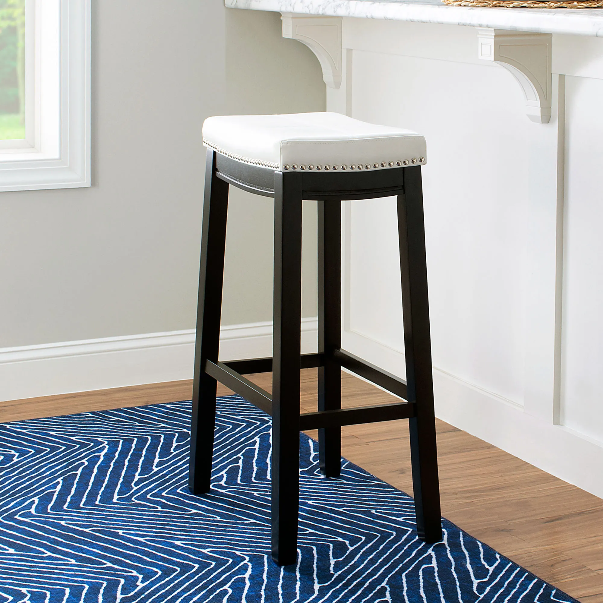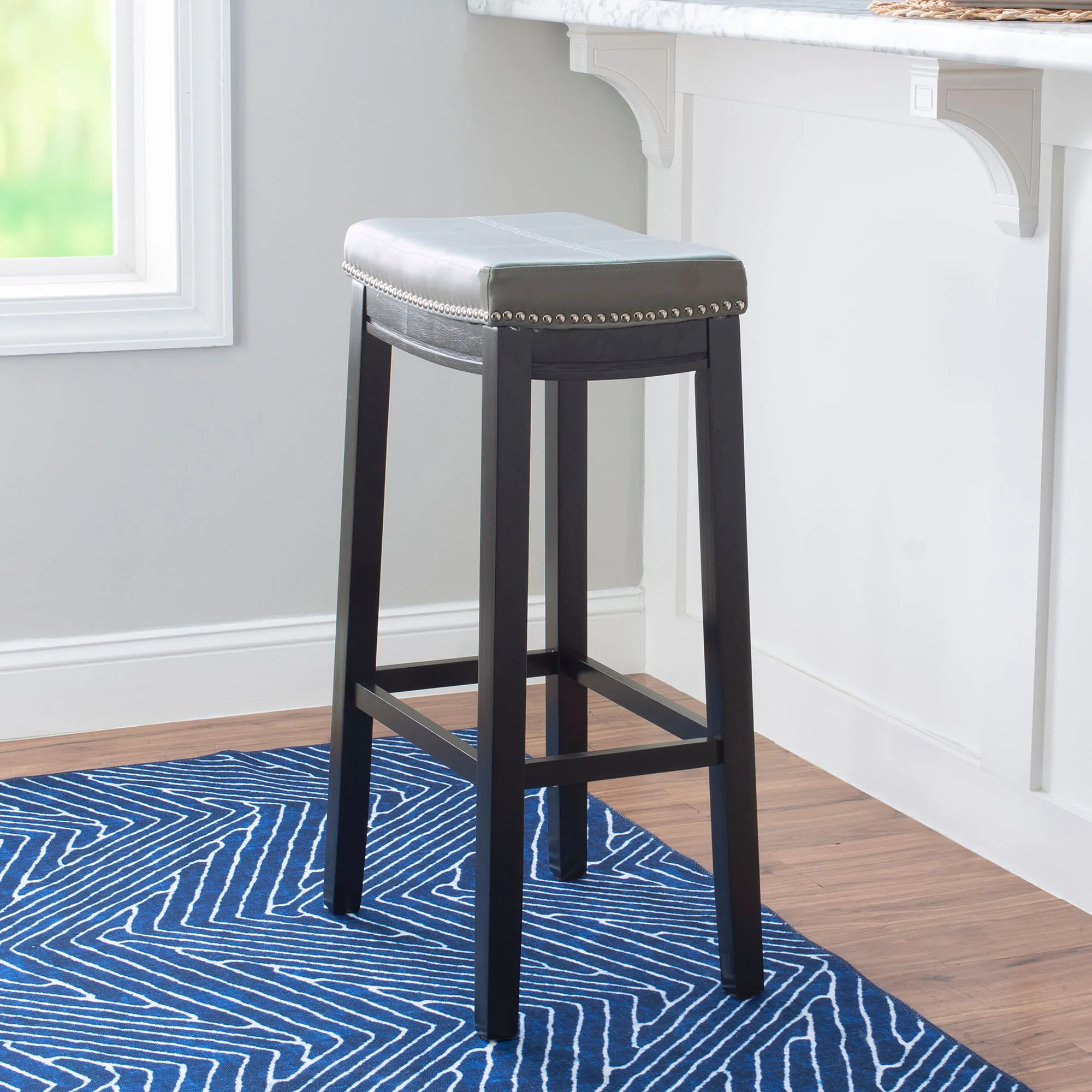 Be sure to have a seat on the sleek and modern Erindale Kitchen Bar Stool. The wood stool is perfect for any high tabletop or bar space. Backless stool has a black finish, an upholstered faux leather seat, double stitching, foam fill, and silver metal nailhead trim. The maximum recommended weight for each stool is 275 lbs. The bar stool is perfect for counter or table heights of 40"-43". Bar stool is 19"Wx13"Dx32"H; weighs approx. 18 lbs. Fill is foam. Wipe the fabric clean.