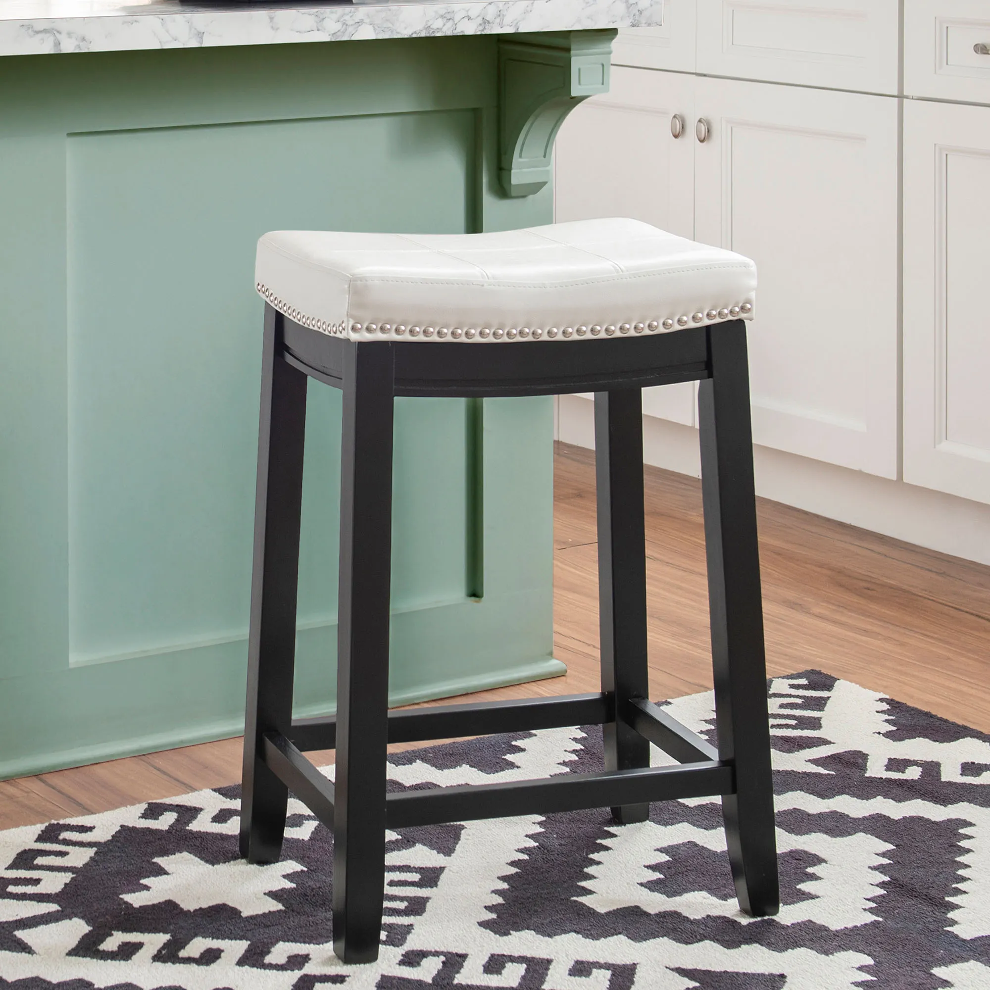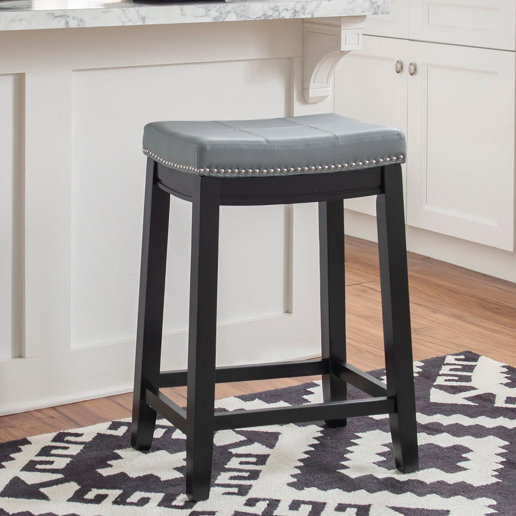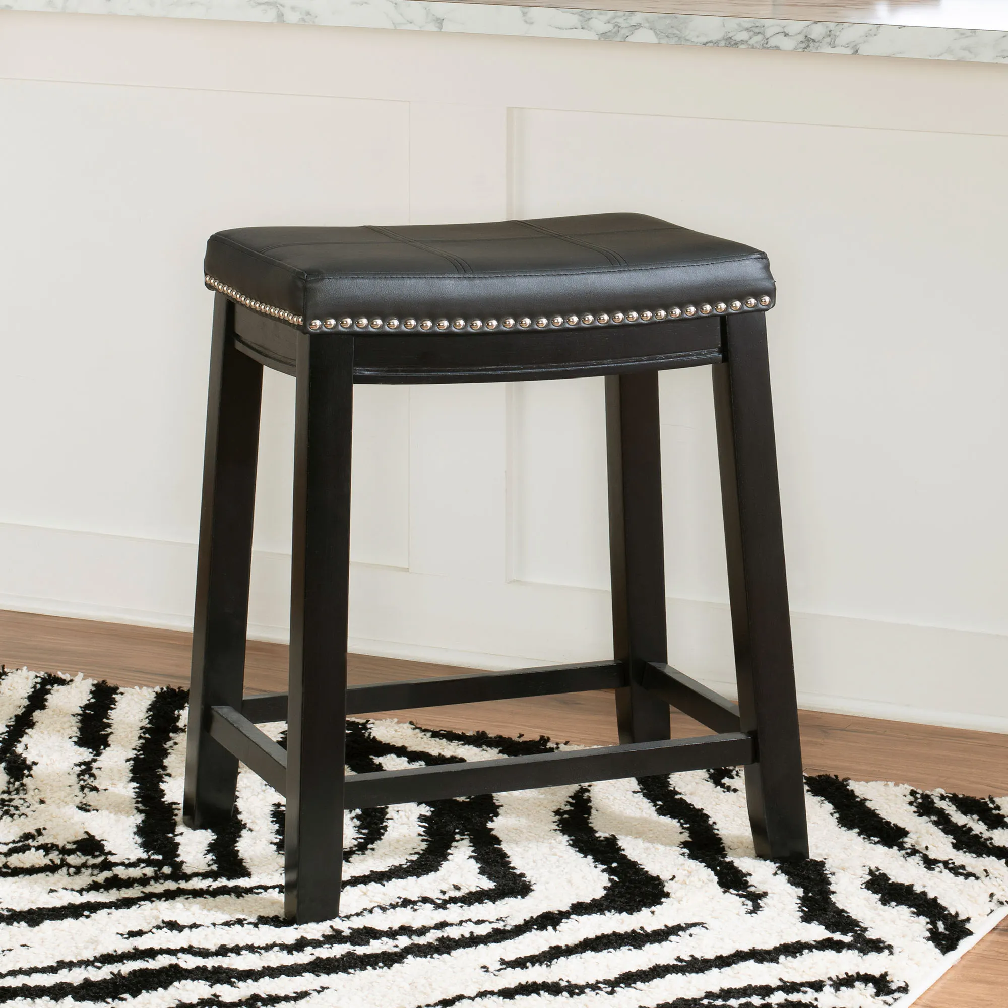 Be sure to have a seat on the sleek and modern Erindale Kitchen Counter Stool. The wood stool is perfect for any high tabletop or counter space. Backless stool has a black finish, an upholstered faux leather seat, double stitching, foam fill, and silver metal nailhead trim. The maximum recommended weight for each stool is 275 lbs. The counter stool is perfect for counter or table heights of 35"-39". Counter stool is 18"Wx12.5"Dx26.5"H; weighs 17 lbs. Fill is foam. Wipe the fabric clean.