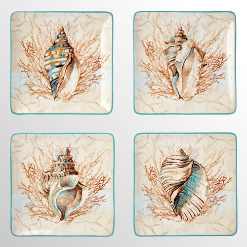 Escape to the Sea Coastal Seashell Square Ceramic Dessert Plate Set of 4