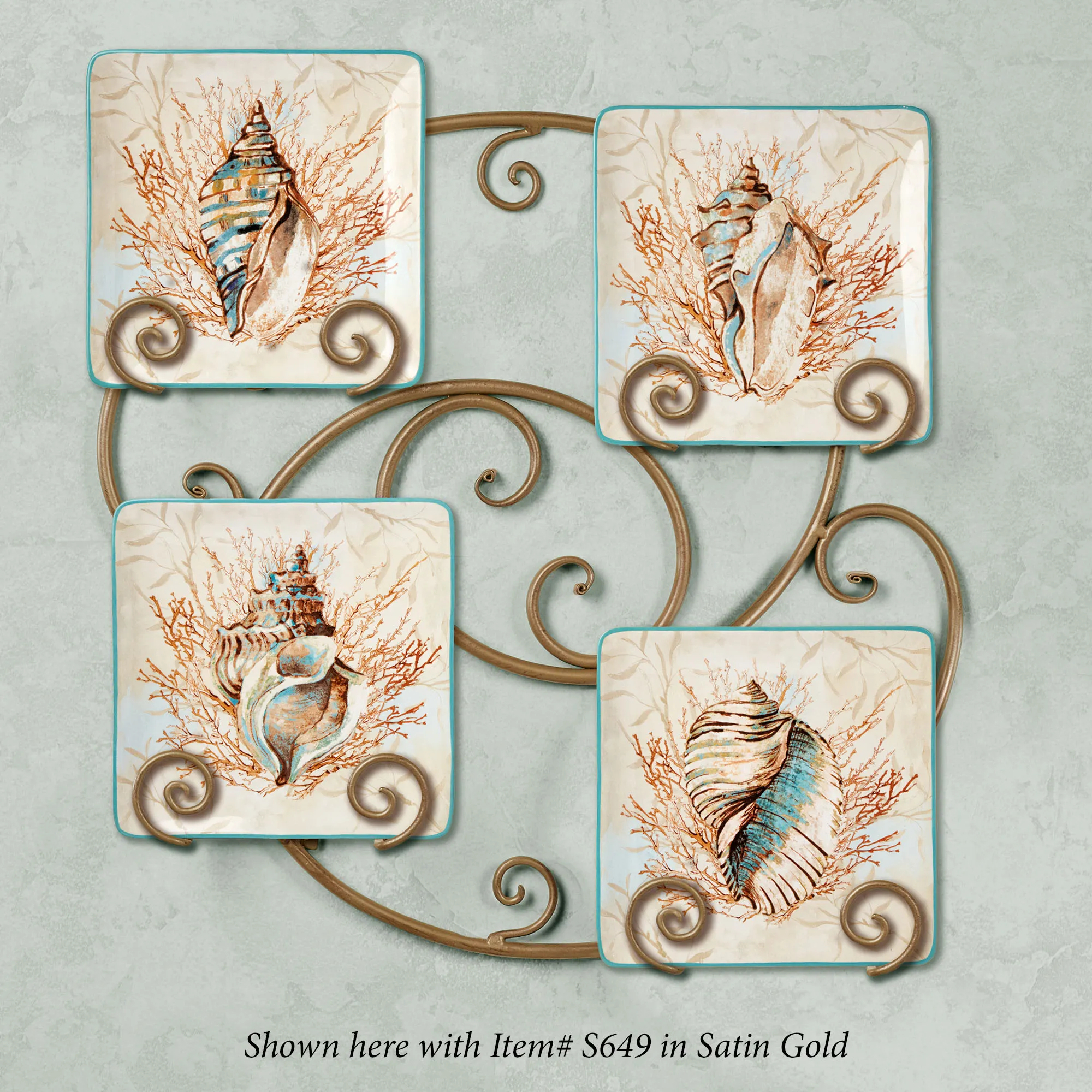 Allow your coastal tastes to Escape to the Sea for dessert. Handpainted with decal accents, each gloss-finished ceramic dessert plate in the set features a conch shell, coral, and seaweed in shades of blue, tan, and brown. Finished with a blue rim, each dessert plate measures 8.5"sq.x1"H. Food-, dishwasher-, and microwave-safe. Plate rack is not included.