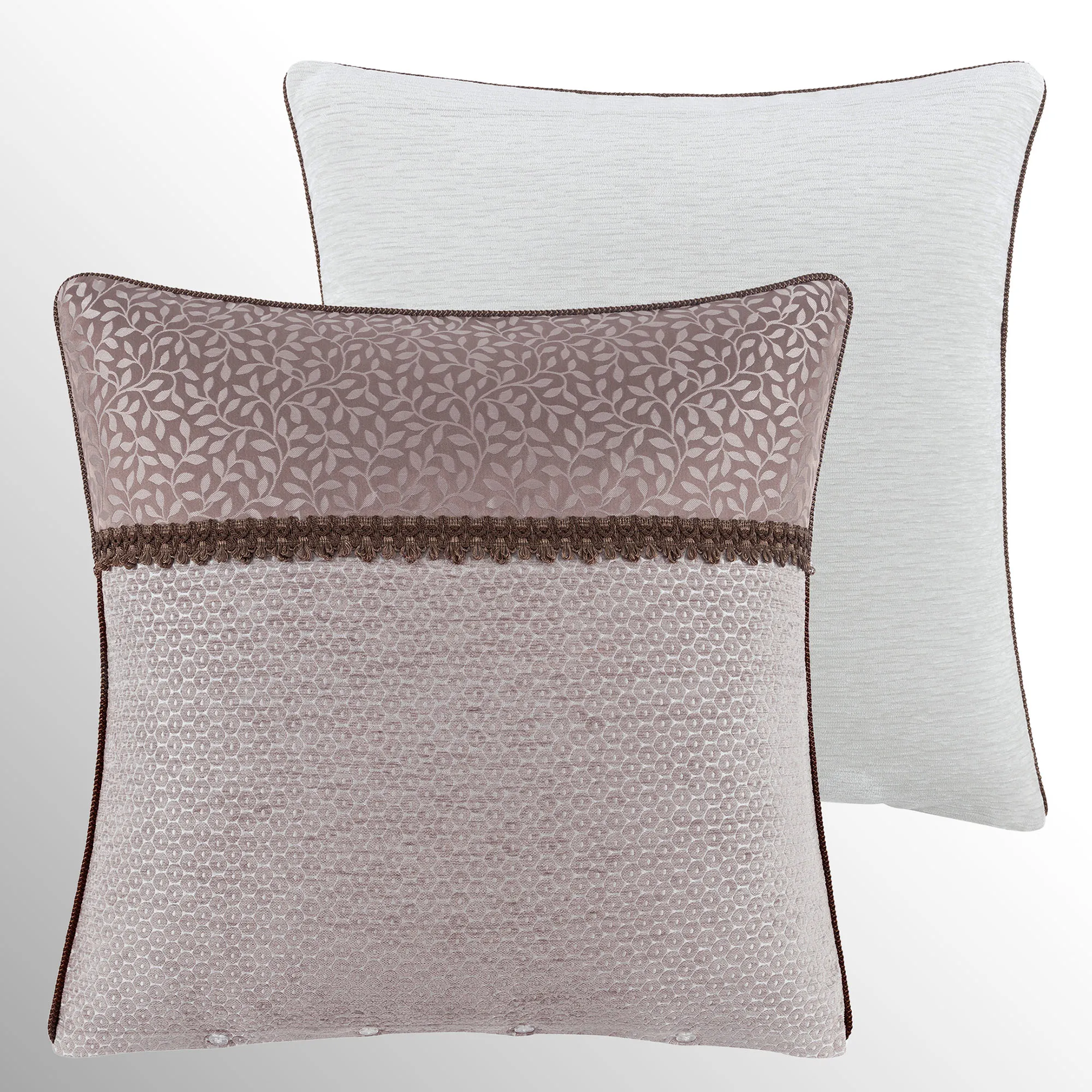The reversible, polyester European Sham has a brown jacquard-woven leafy top, gimp trim accent, geometric chenille bottom, and braided cording edges; reverses to jacquard-woven textured white chenille; bottom button closure. Dry clean only.