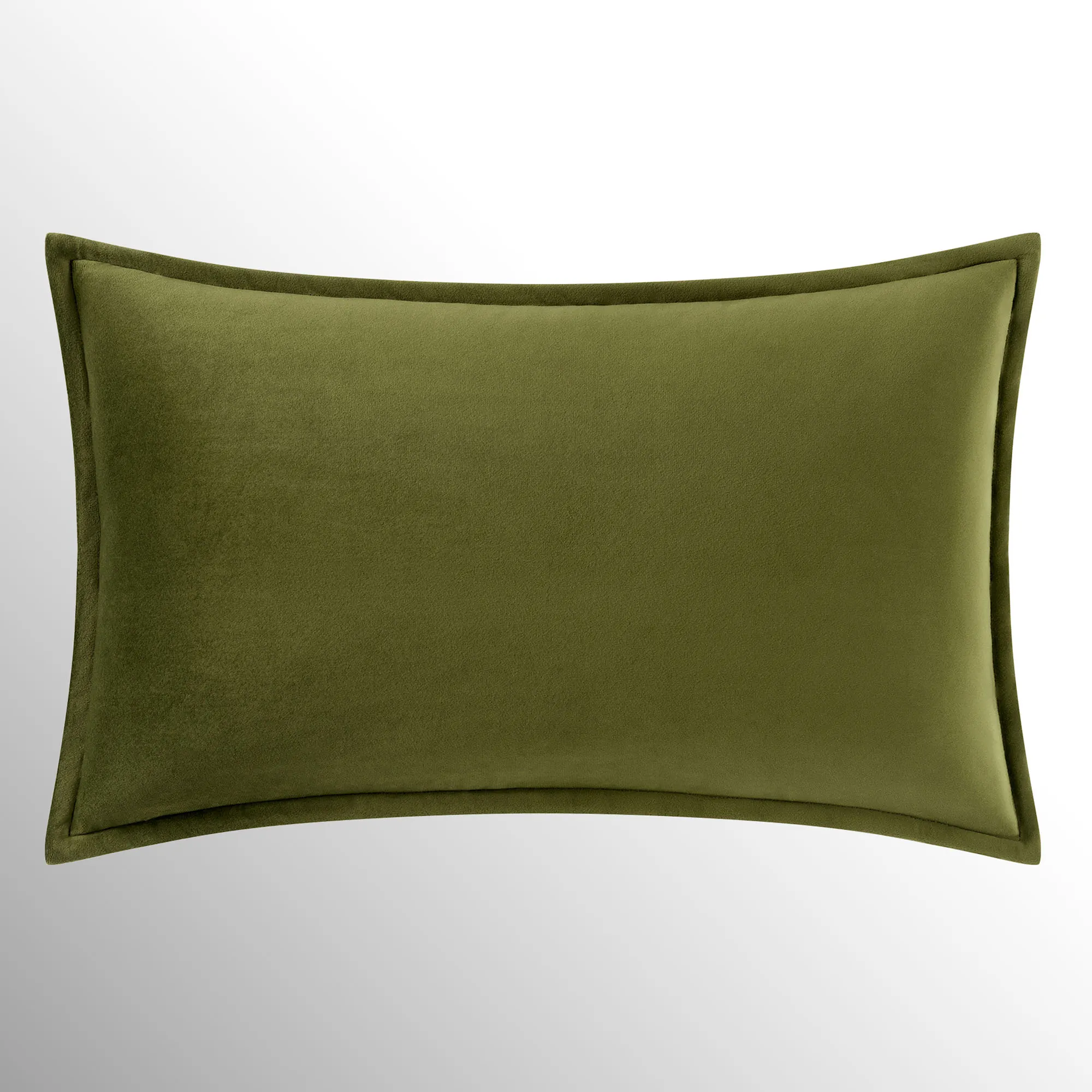 Pillows: Spot clean only. Reversible Rectangle is velvet green polyester with flanged edges; zipper closure. Square has florals and braided cording edges; reverses to chenille geometrics. Pieced Neckroll has a polyester chenille geometric center, gimp trim accents, white chenille sides, and braided cording ends.
