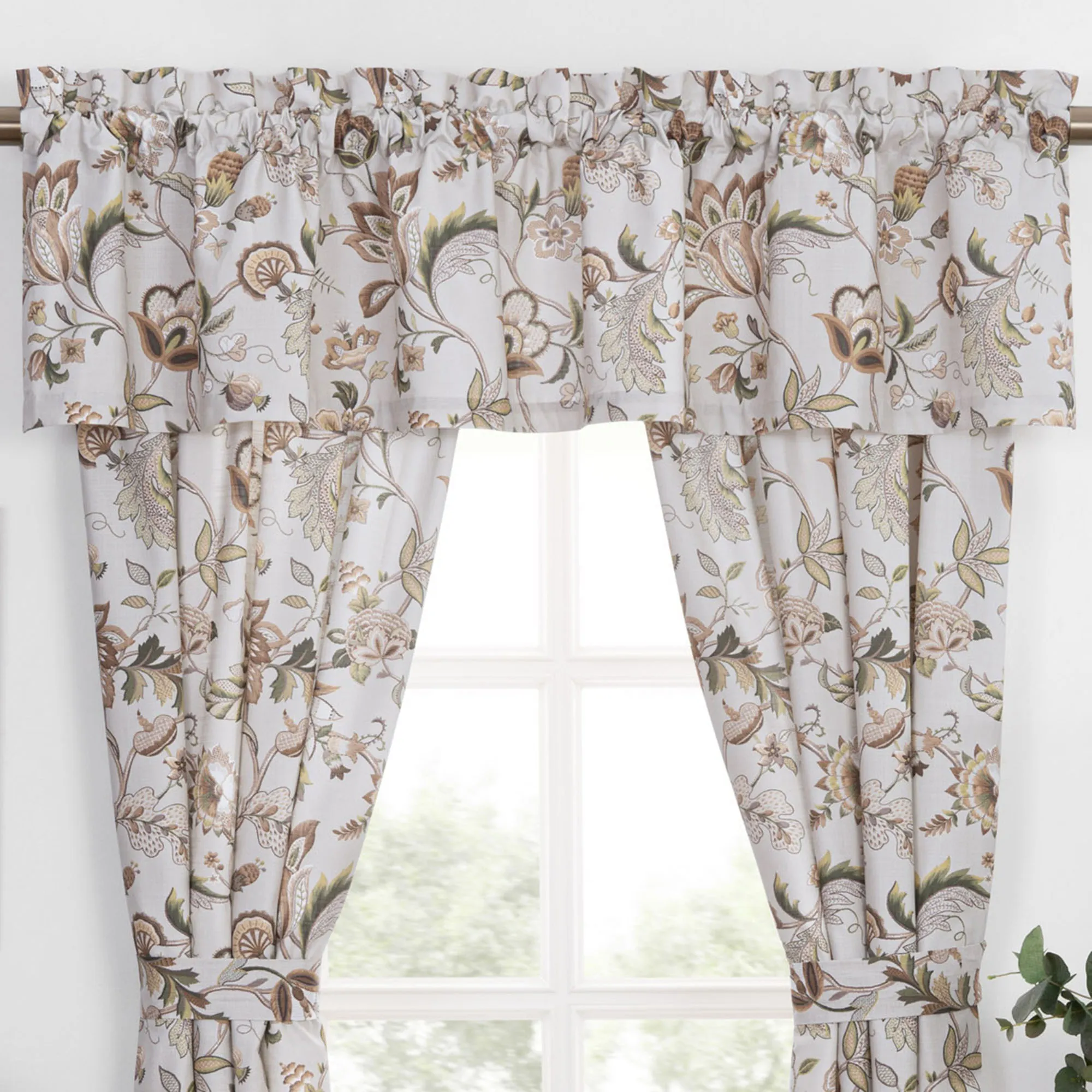 Lined Window Treatments have florals, tailored edges, and 3" rod pockets. Wide Curtain Pair includes tiebacks. Valance is also available.