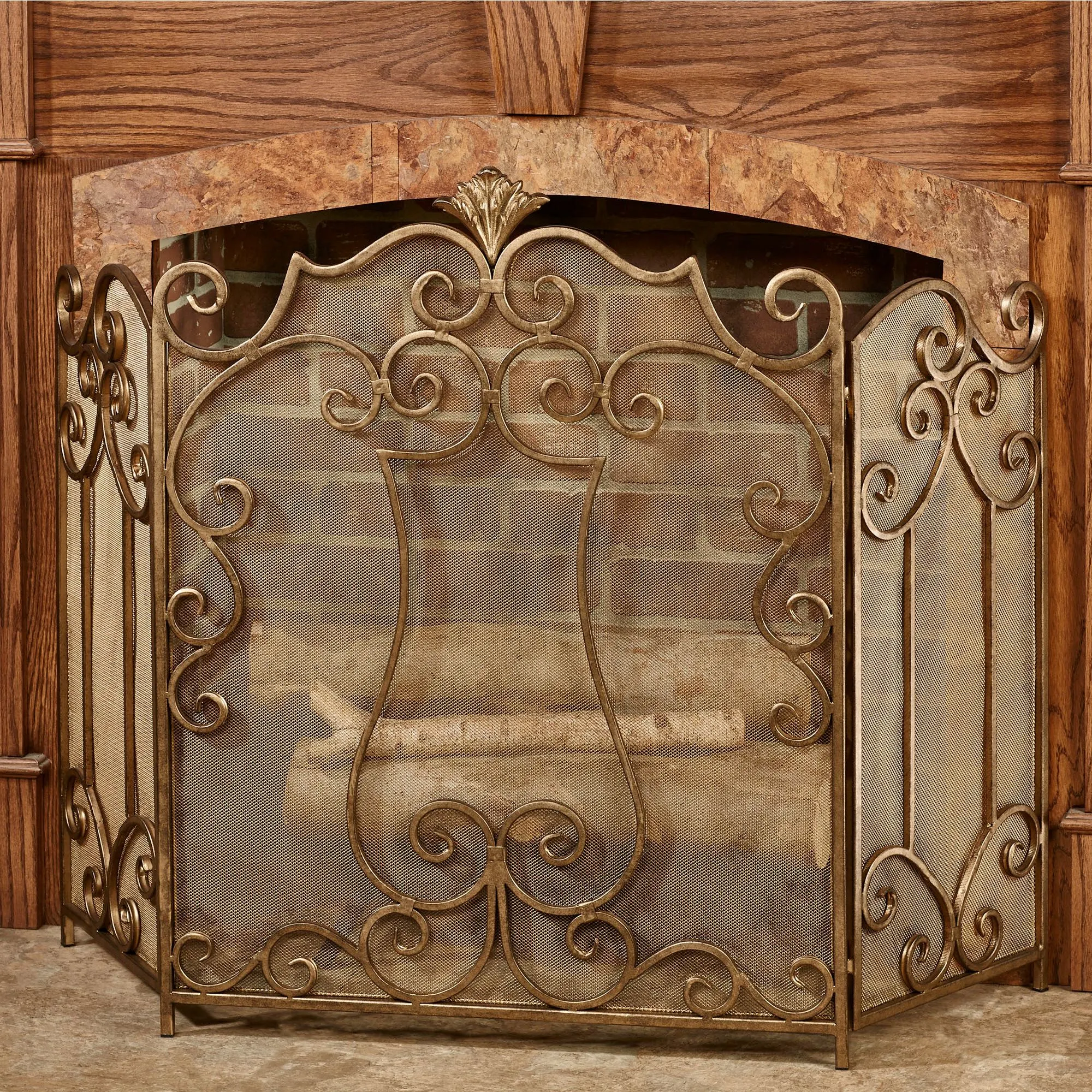 Swirling scrolls and a fleur ornament give the Esmeralda Fireplace Screen its stately appearance. Made of metal, this beautiful fireplace screen has an antique gold finish with textured bronze antiquing. Center panel is 25"Wx31.5"H; side panels are each 12"Wx27.5"H. Fireplace screen weighs approx. 13 lbs.