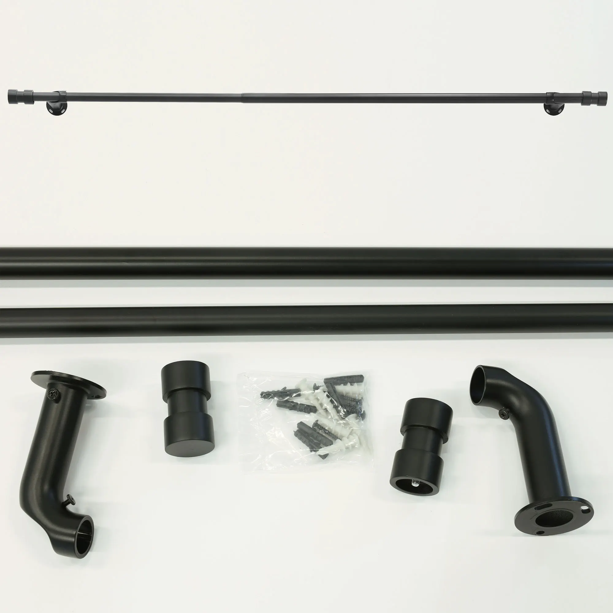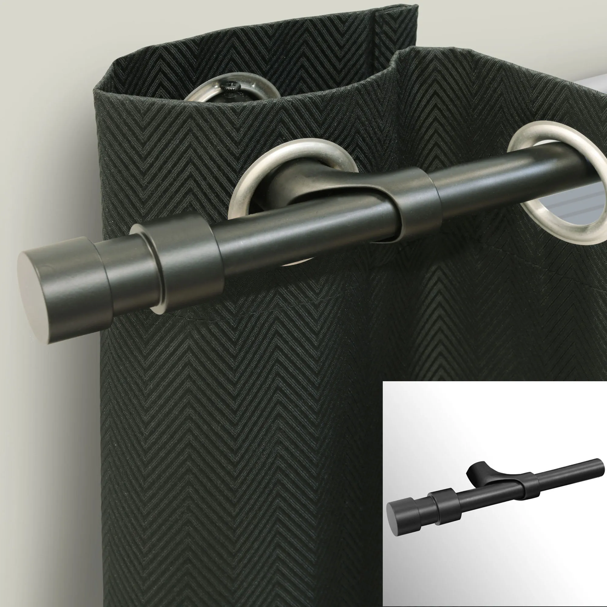 The Esra Thermaplus(TM) Wraparound Curtain Rod Set covers any window in style. This black steel rod has a unique design that allows your curtains to wrap around to the wall to reduce noise, block light, and save energy. Rod has locking screws on the brackets to ensure that the window treatment remains against the wall. This set includes a 1" dia. telescopic rod, two brackets that project 3.5", and two double cap finials that are 2"dia.x4"L each. The 72"-144" size also comes with a center support bracket.