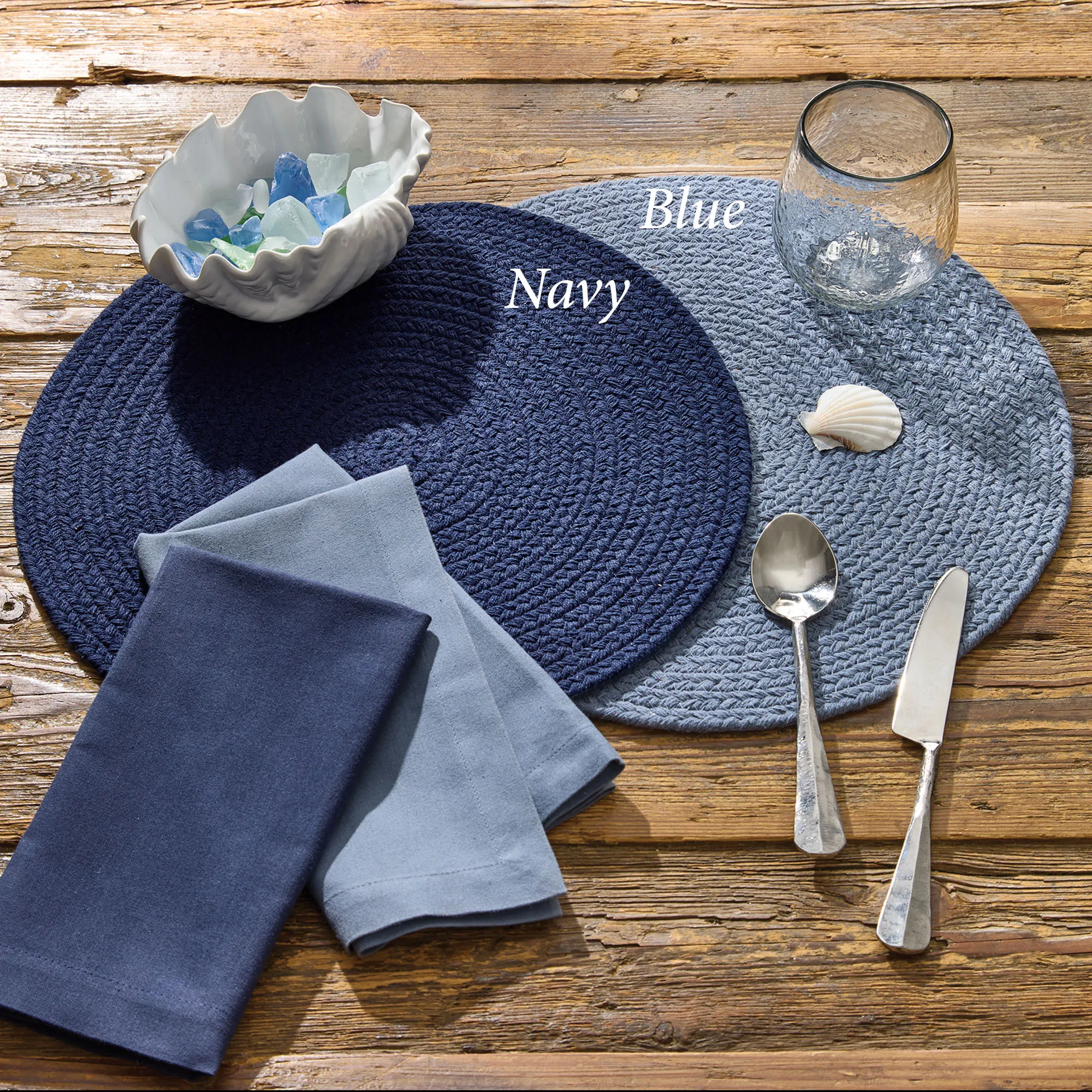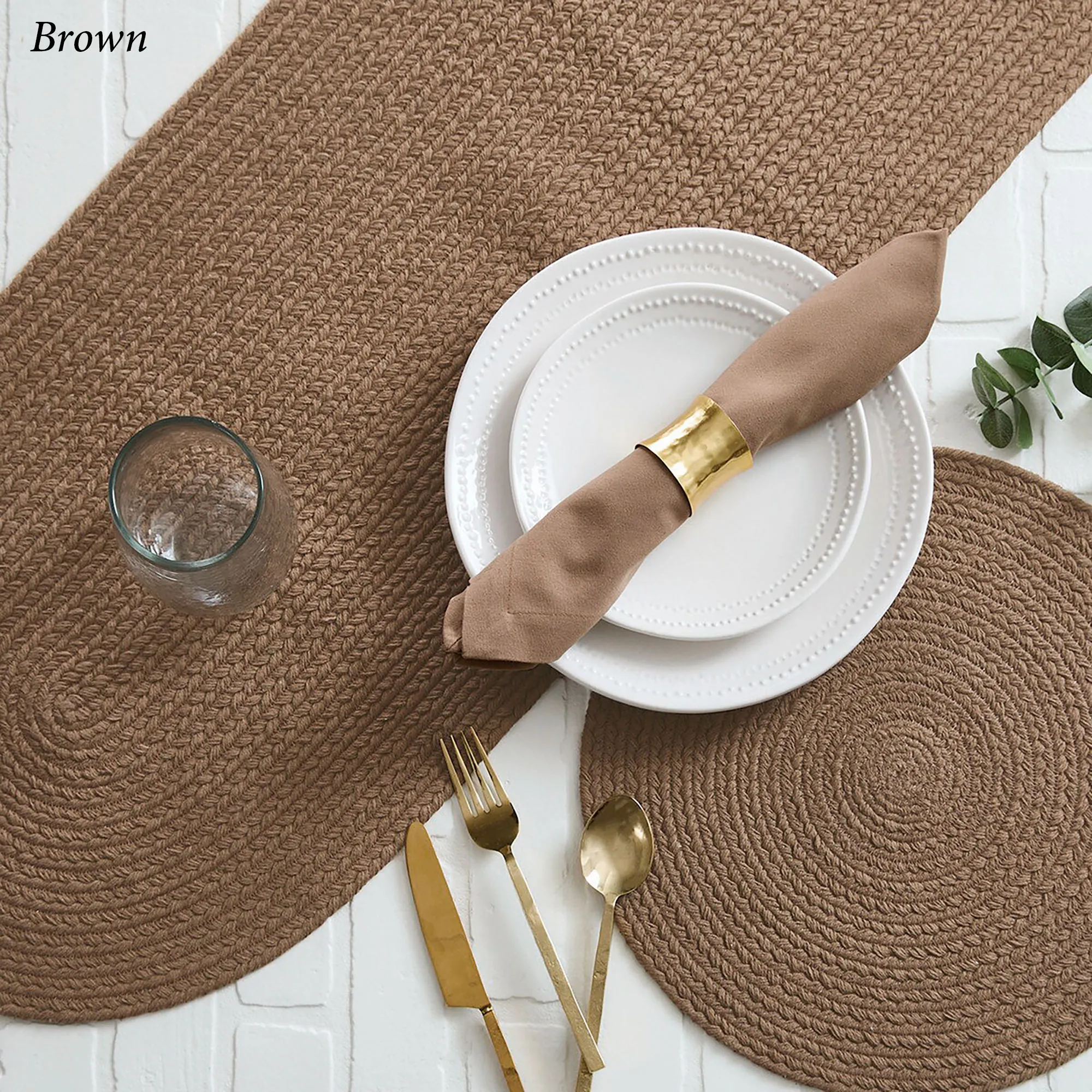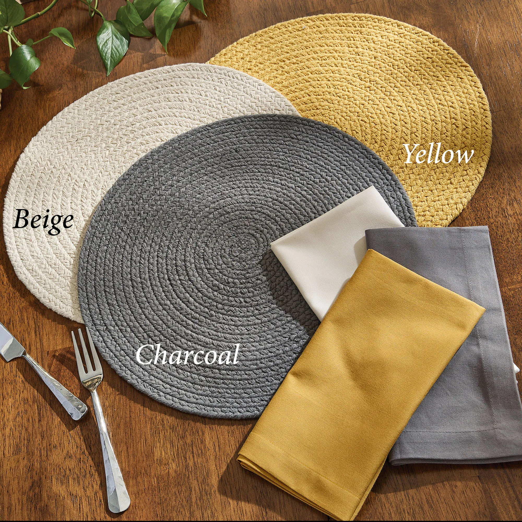 • Placemats and runner have a yarn-braided design