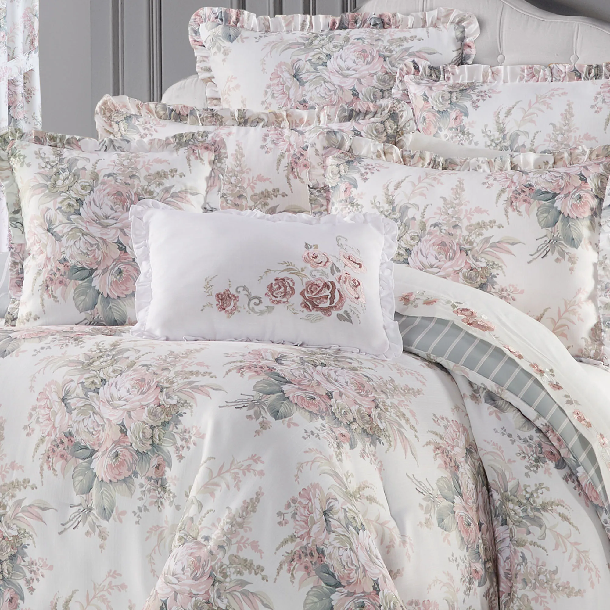 Comforter Set includes comforter, bedskirt, and shams. Comforter has floral blossoms on a woven off-white background and a ruffled flange on three sides. Comforter is reversible to a coordinating stripe print in blush, light gray, and off-white. Bedskirt has the coordinating stripe print, kick pleats, and split corners in the 15" drop. Shams mimic the comforter and have ruffled flanges and French back closures. For comforter set, choose Full, Queen, King, or Cal King.