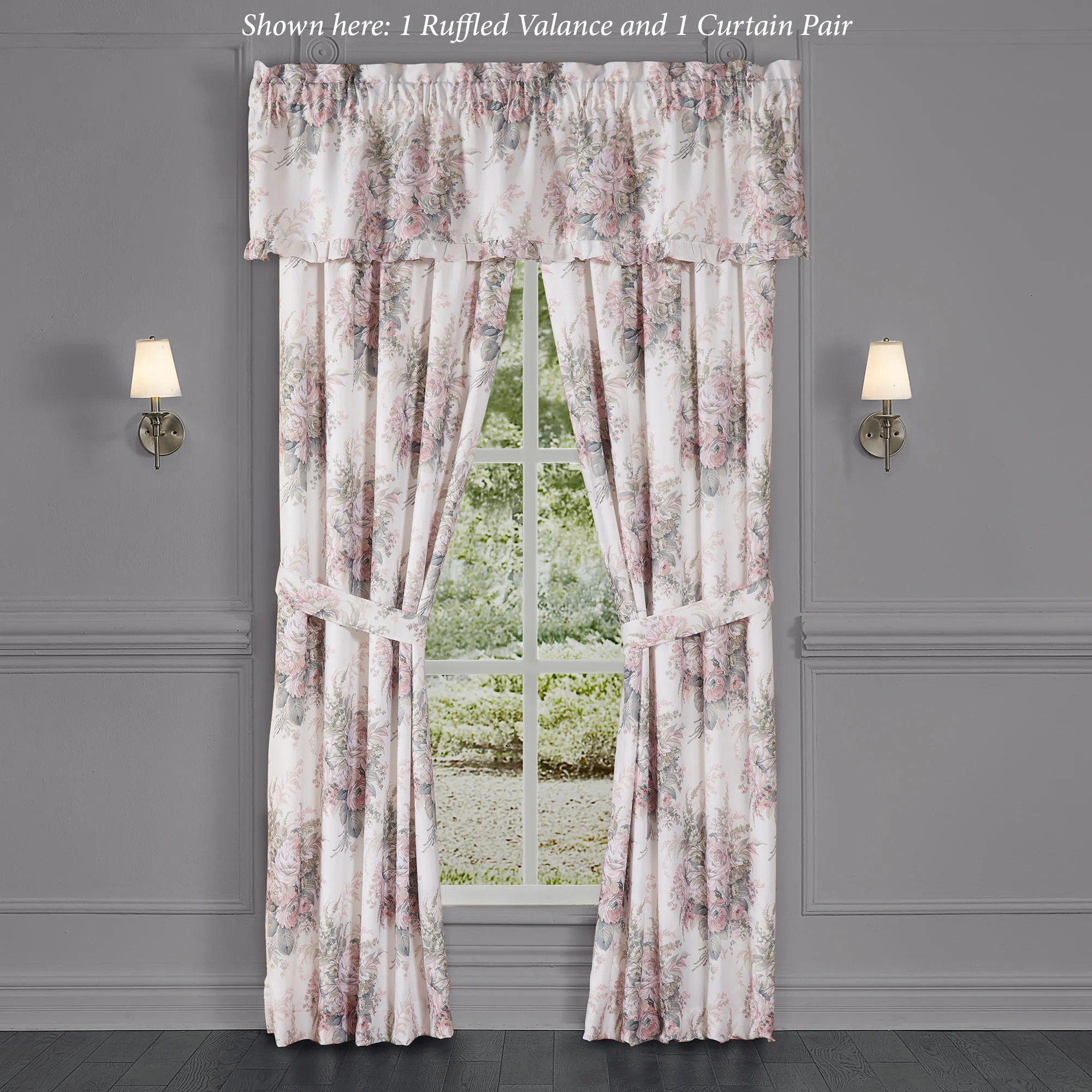 Tailored, lined Window Treatment has florals on a woven background and 3" rod pockets. Curtain Pair includes tiebacks. Valance has a ruffled edge.
