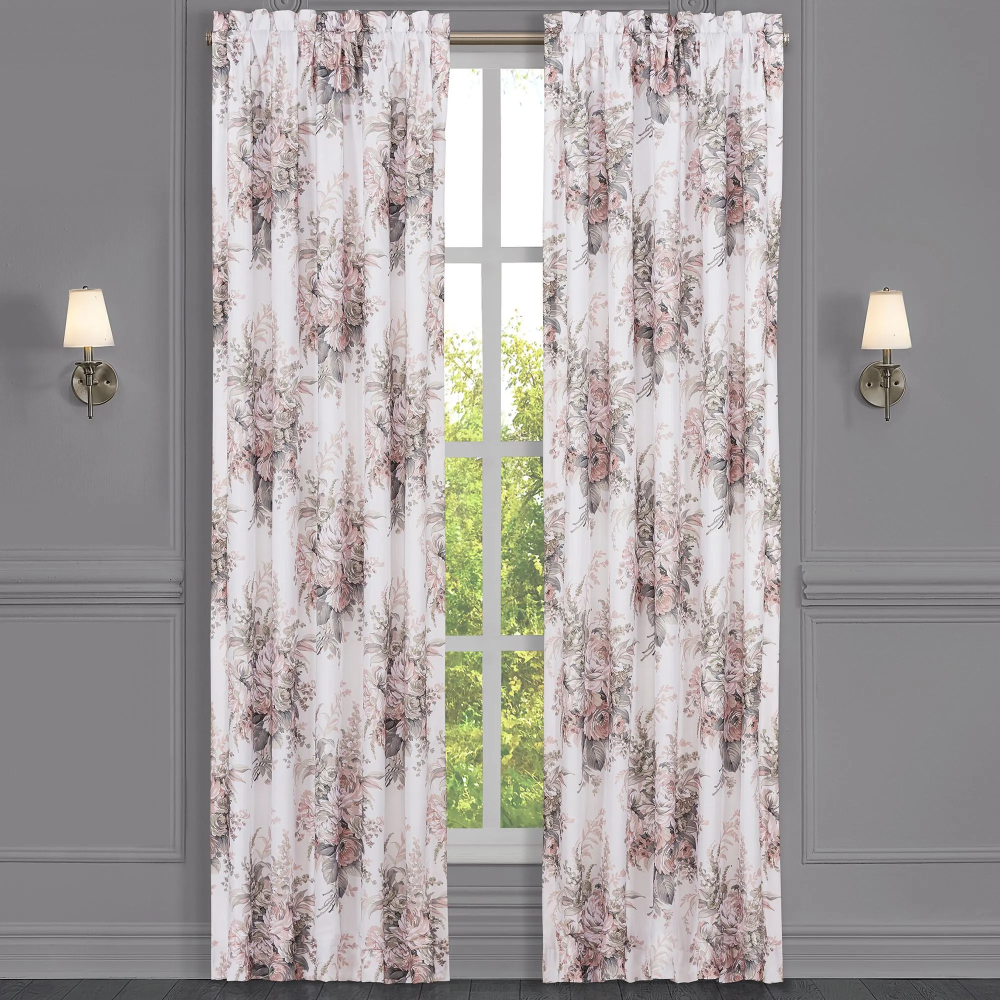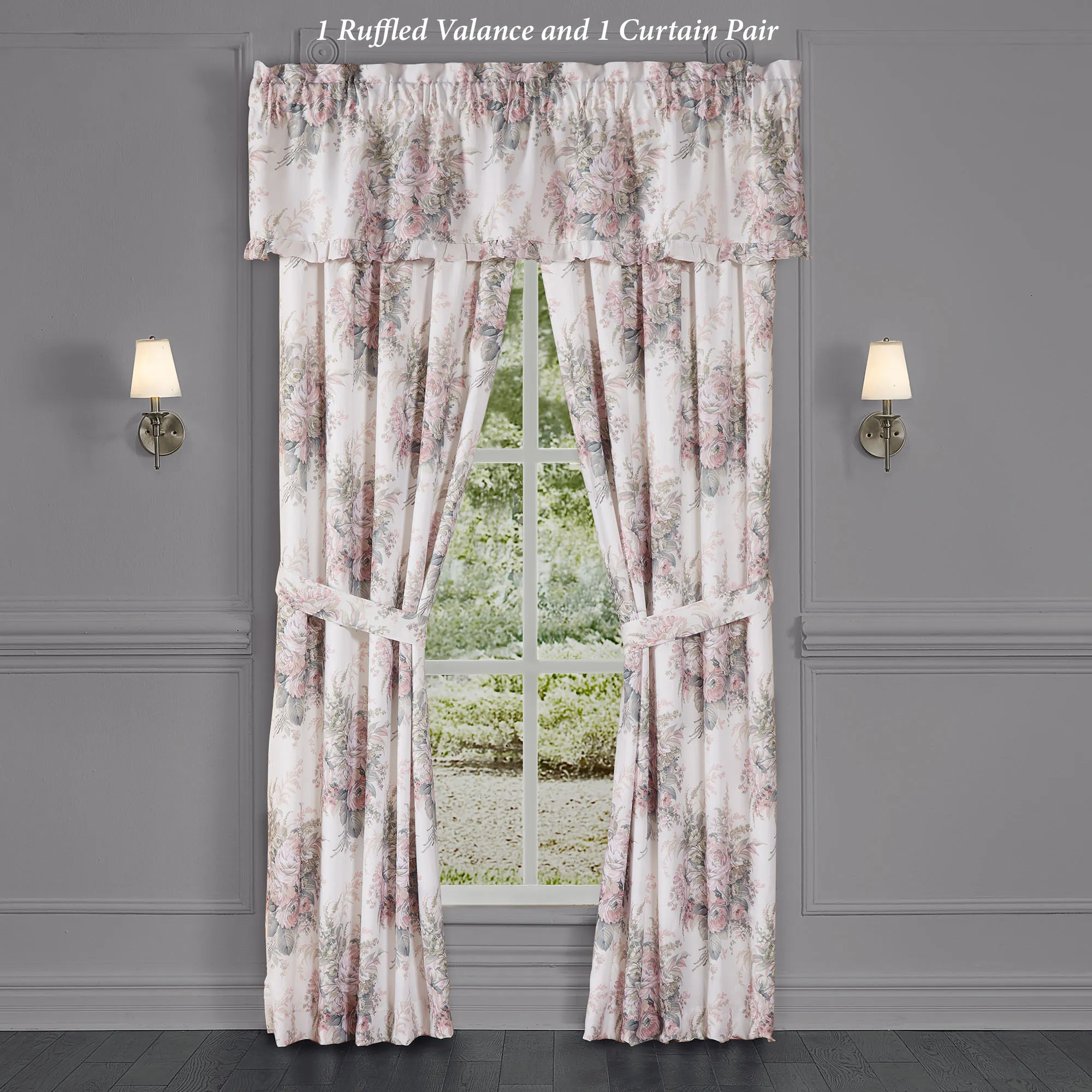 Tailored, lined Window Treatment has florals on a woven background and 3" rod pockets. Curtain Pair includes tiebacks. Valance has a ruffled edge.