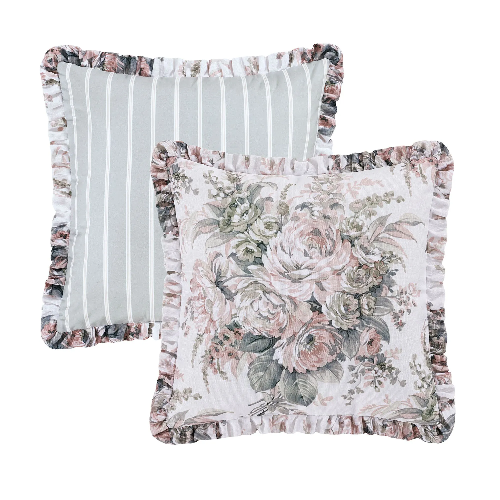 European Sham has florals on a woven background and a ruffled flange; reversible to coordinating stripes. Zipper closure.