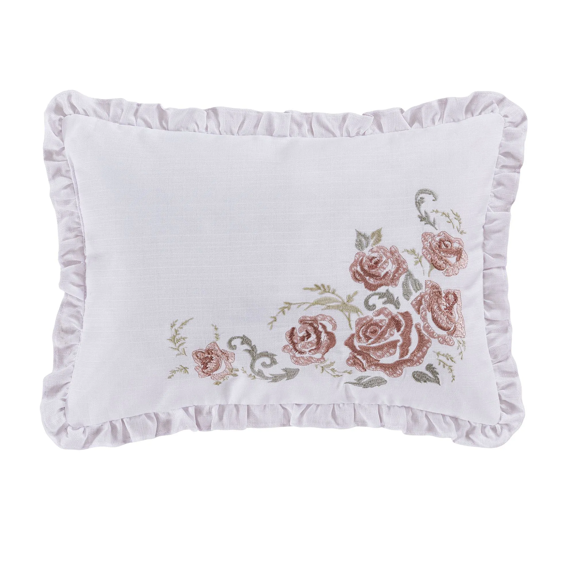 Pillows: Spot clean. Square has florals on a woven background and a ruffled flange; reversible to coordinating stripes. Textured Rectangle has embroidery on off-white and ruffled edges.