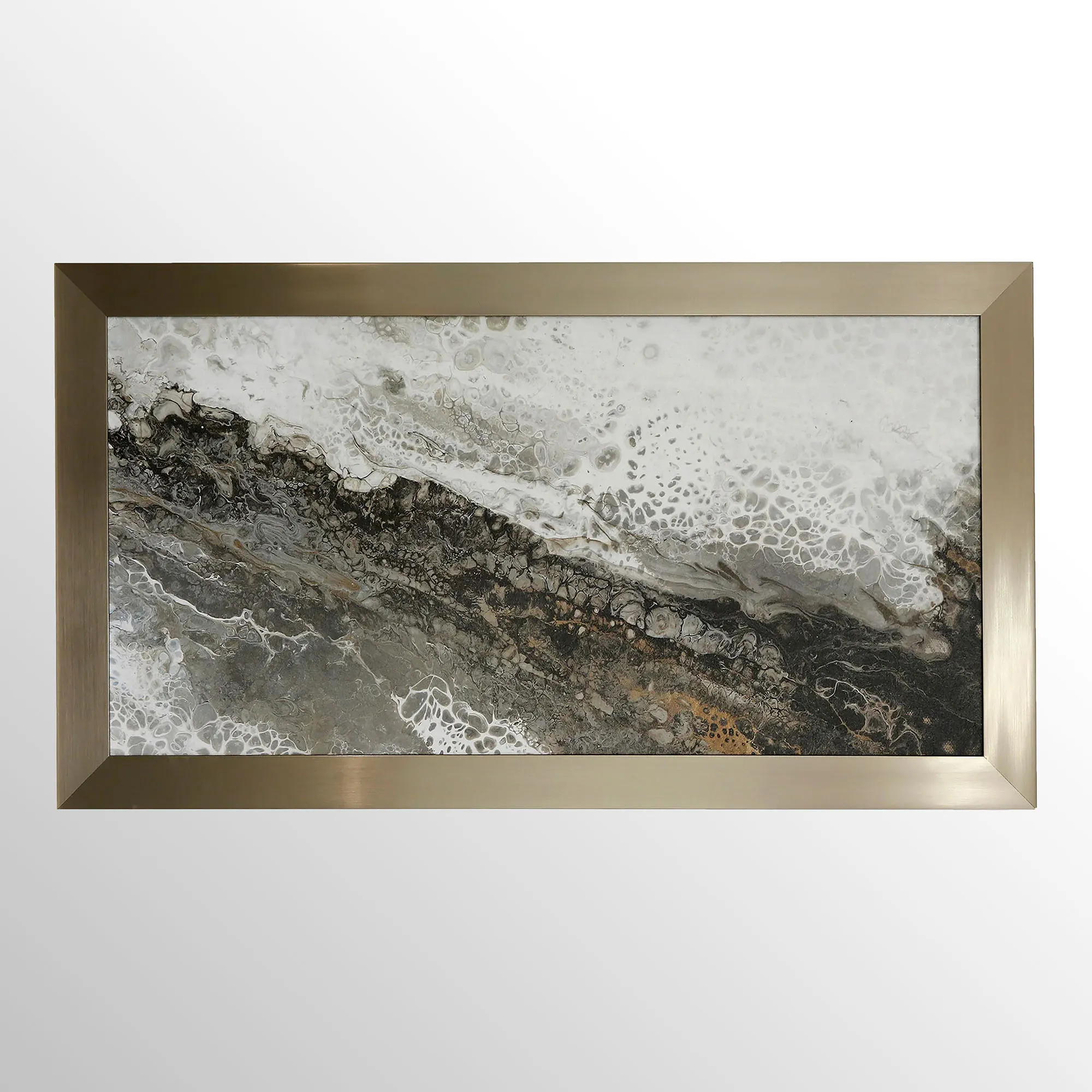 Captivating in color and tone, this framed abstract wall art captures the Eternal Embrace between light and dark. Proudly made in the USA, the printed paper scene features black, slate, white, and copper hues in a fluid, artistic array. A champagne gold polystyrene frame completes the design. Overall, the framed print wall art measures 35"Wx1.5"Dx29"H and weighs 10 lbs.