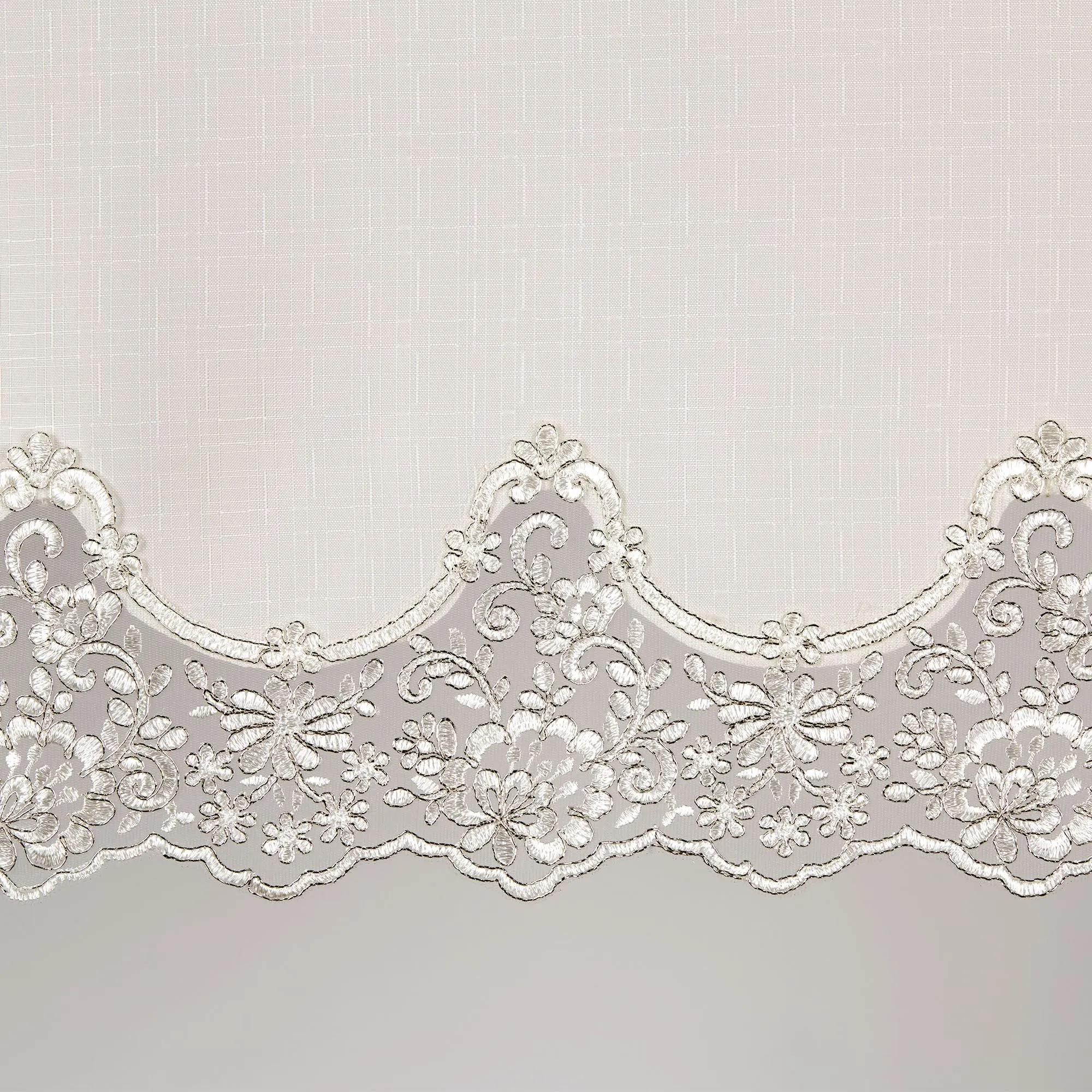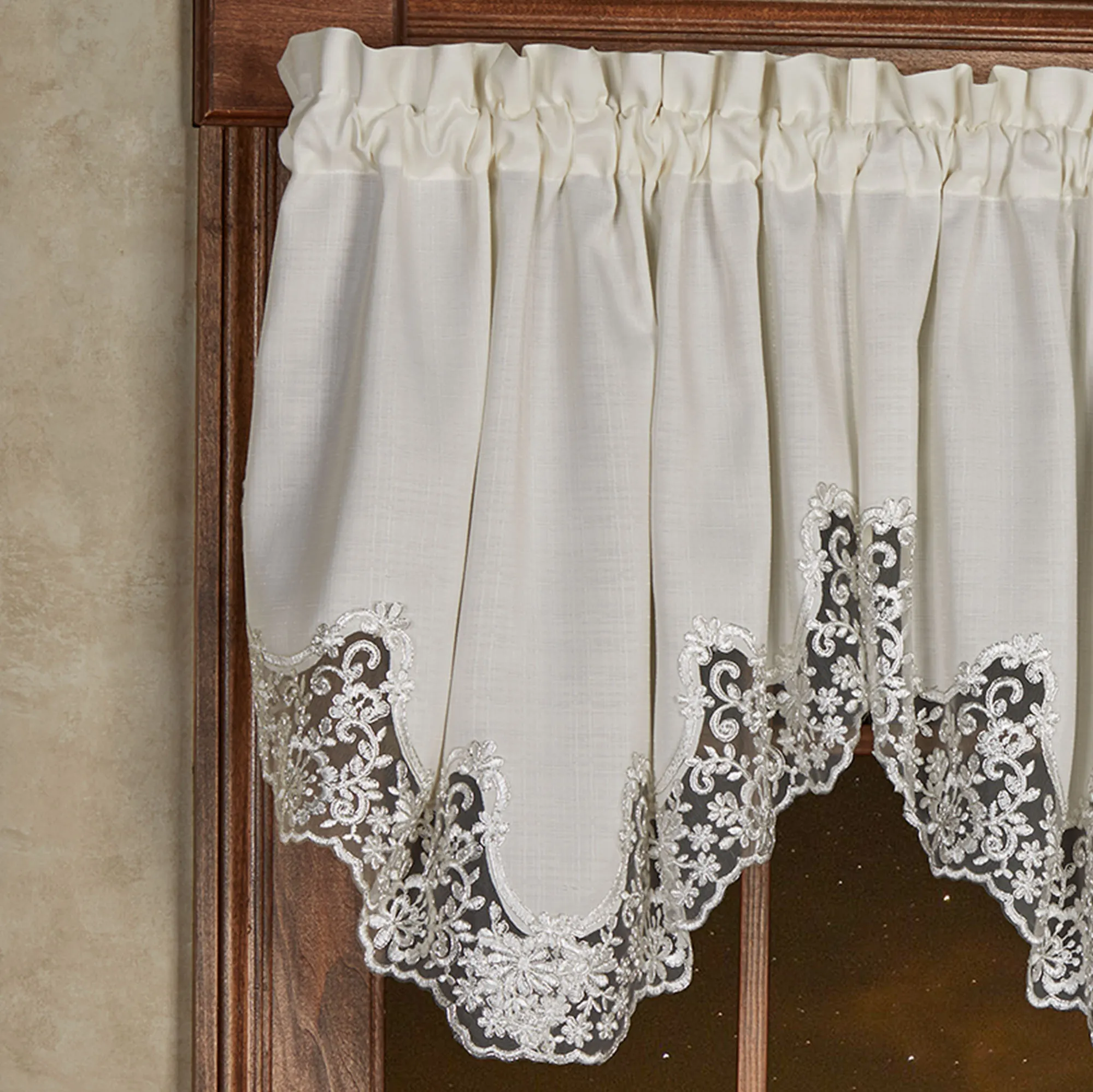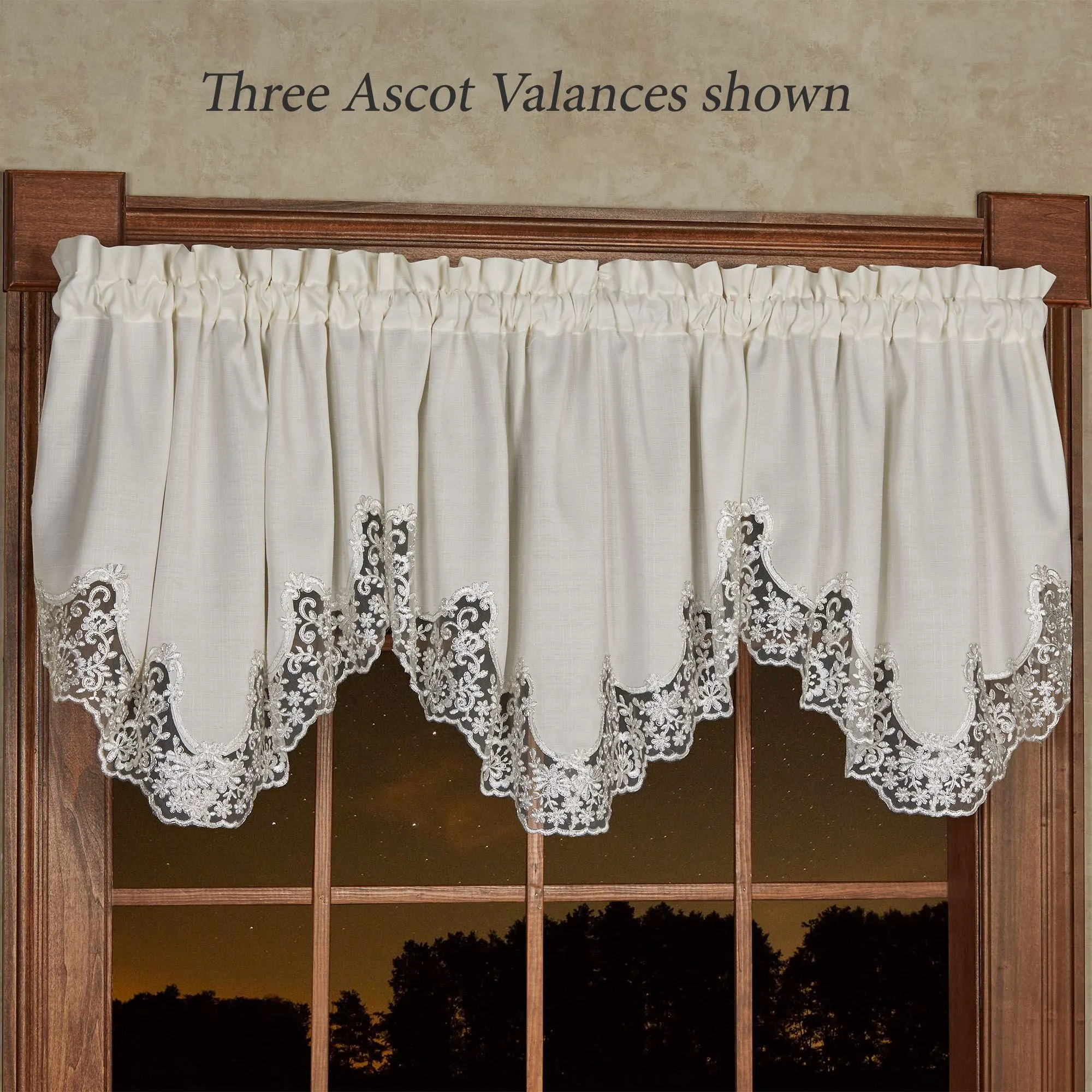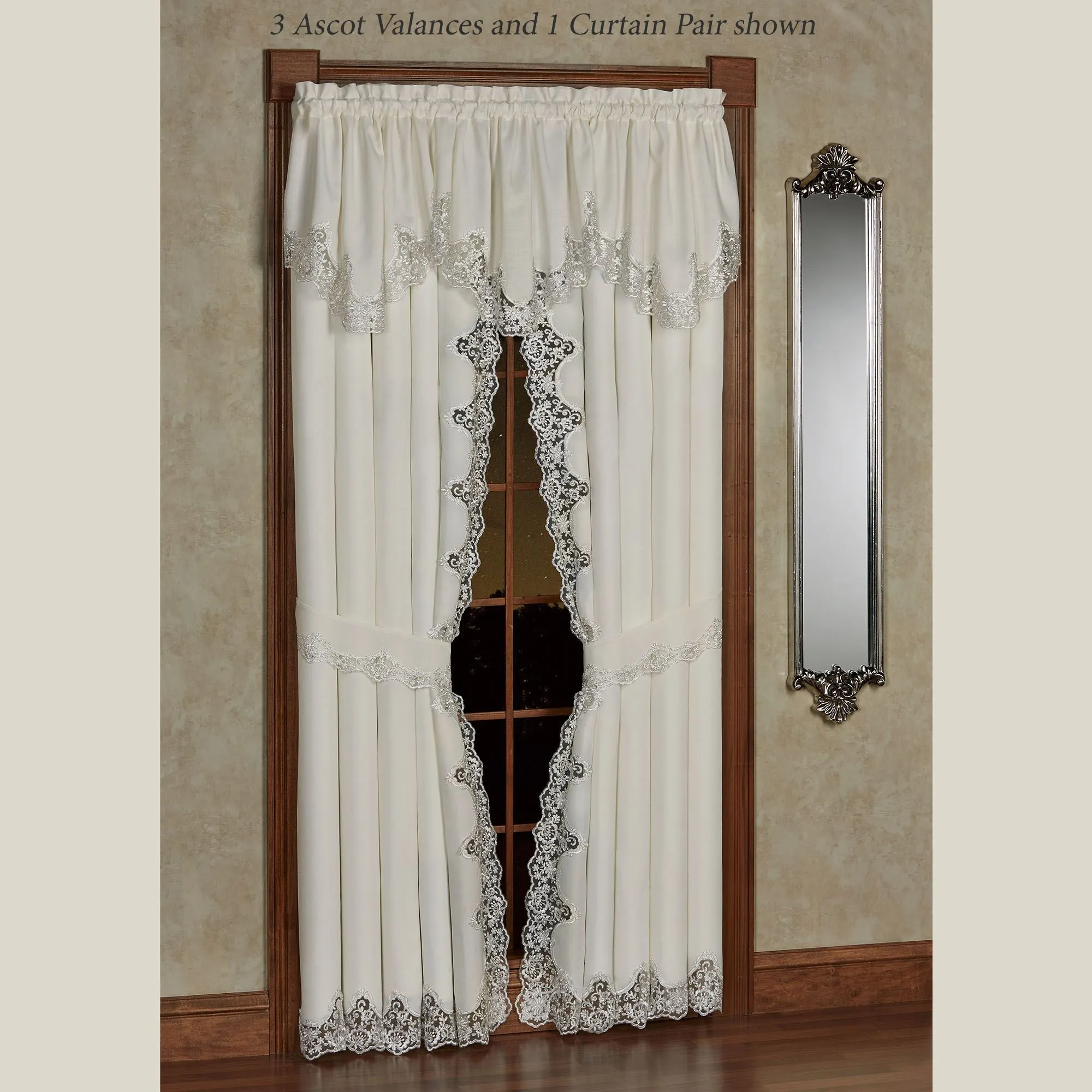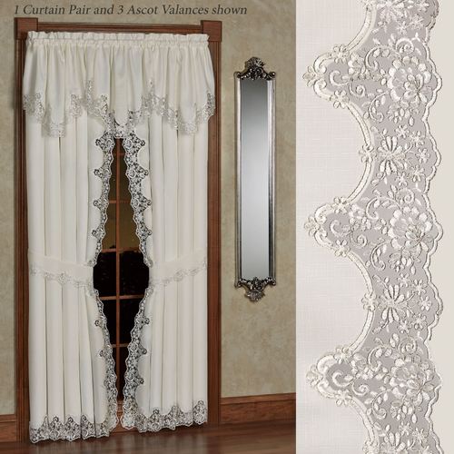 The Evangelina Window Treatment displays lavishly elegant splendor with a signature look. The ivory slubbed polyester window accents have beautifully finished, hand-cut contour edges fancied with silver floral lace. Rod pockets are 1.75". Specify Ascot Valance or Curtain Pair. Ascot Valance is 30"Wx20"L. Curtains include tiebacks and measure 84"W. Machine washable. Imported. The curtain pair width is the total width of two panels together.