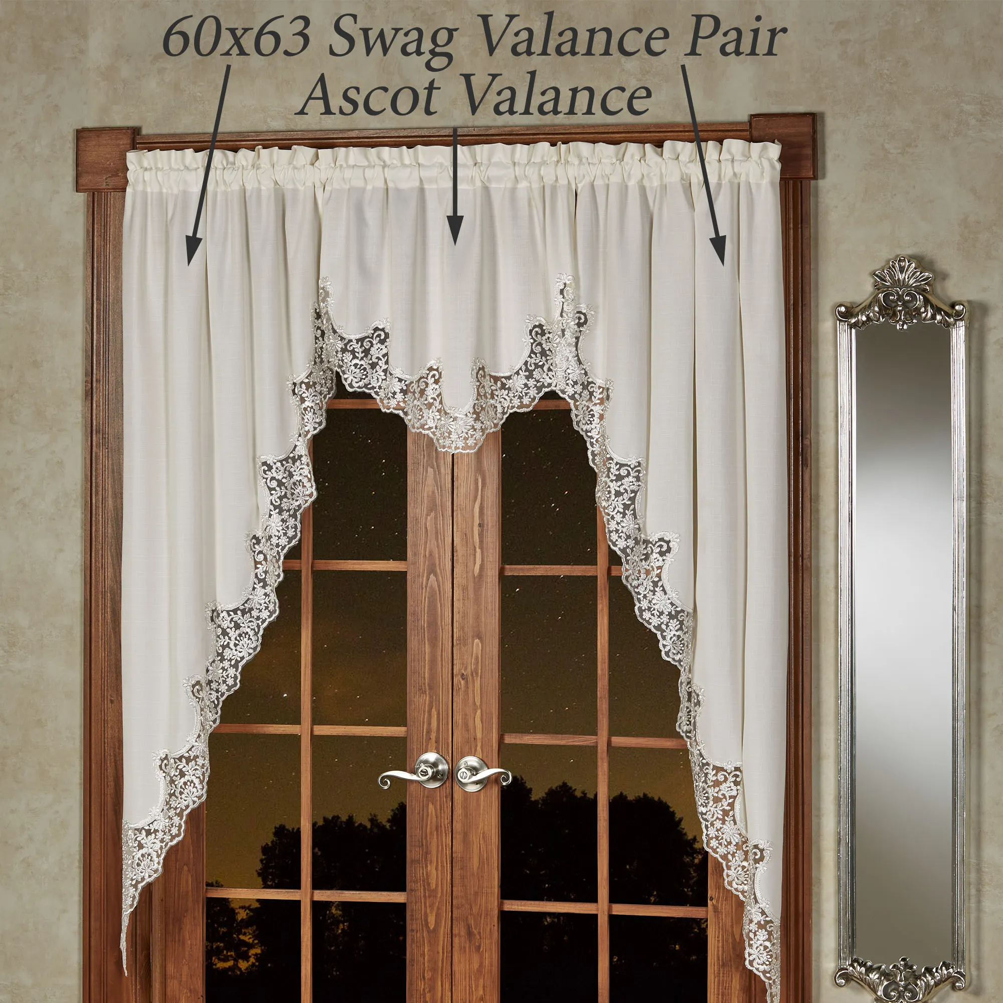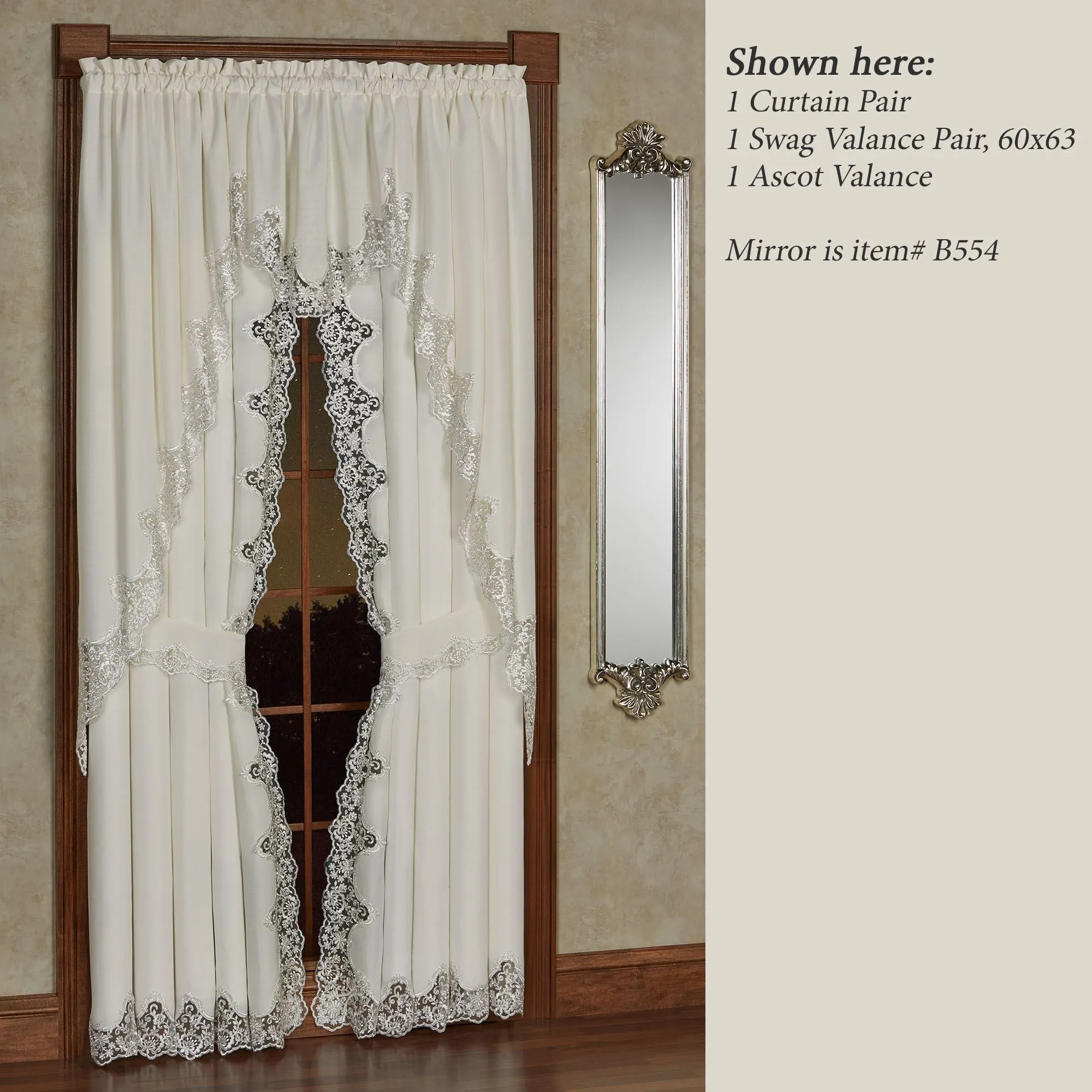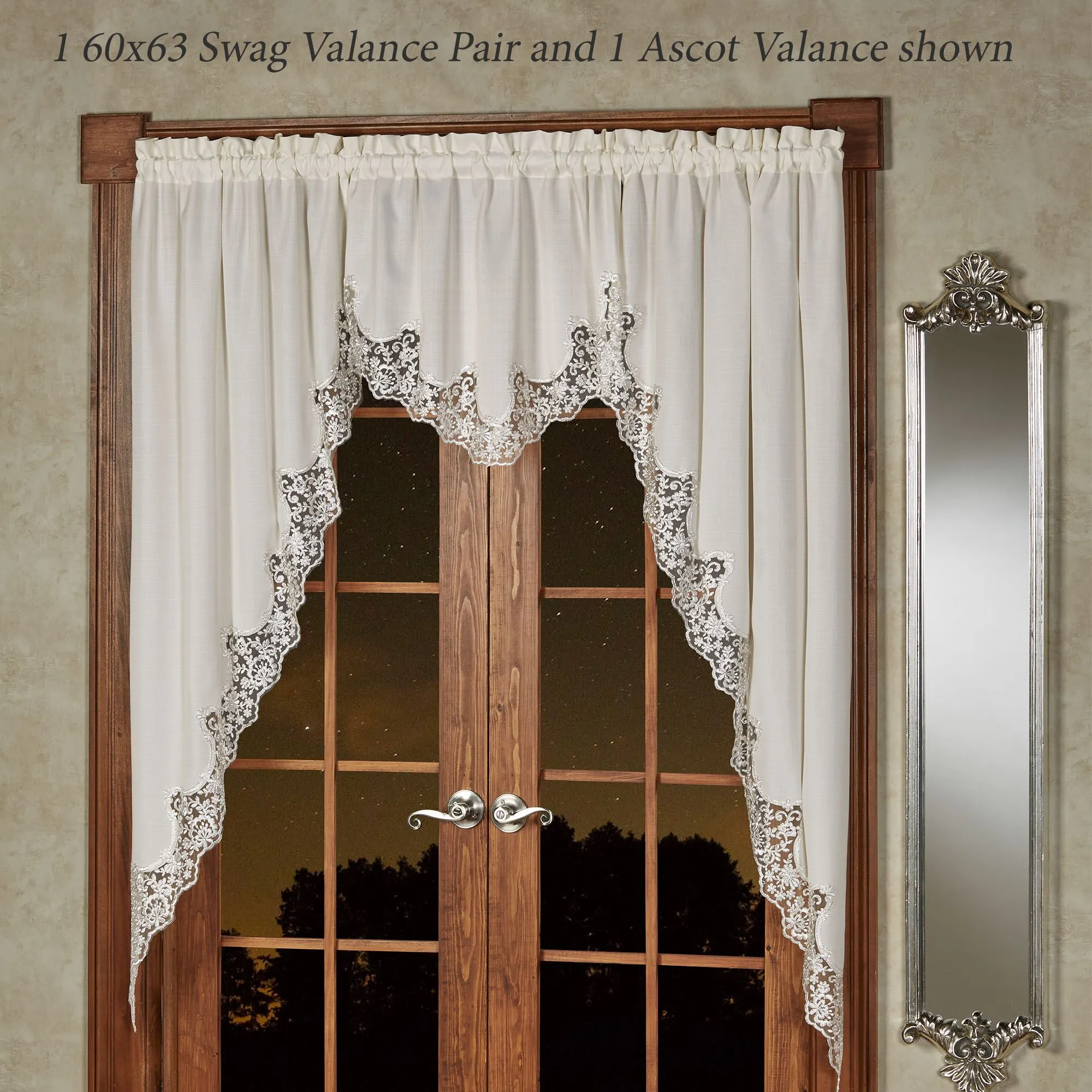 The Evangelina Window Treatment displays lavishly elegant splendor with a signature look. The ivory slubbed polyester window accents have beautifully finished, hand-cut contour edges fancied with silver floral lace. Rod pockets are 1.75". Specify Long Swag Valance Pair, Ascot Valance, or Curtain Pair. Long Swag Valance Pair is 60"Wx63"L. Ascot Valance is 30"Wx20"L. Curtains include tiebacks and measure 84"W; choose 84"L or 95"L. Machine washable. Imported. The curtain pair width is the total width of two panels together.