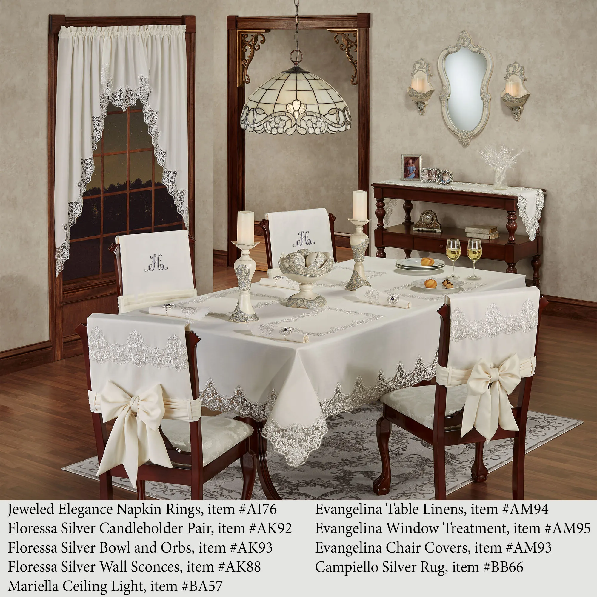 The Evangelina Accessories display lavishly elegant splendor with a signature look. These ivory slubbed polyester table linens have beautifully finished, hand-cut contour edges. Most are fancied with silver floral lace. Choose Placemat Set of 4, Napkin Set of 4, Table Runner, Oblong Tablecloth, or Round Tablecloth. Placemats are 20"x14". Napkins have floral embroidery and are 18" sq. Table Runner is 16"W. Oblong Tablecloth is 70"W. Round Tablecloth is 70" dia. Machine washable. Imported.