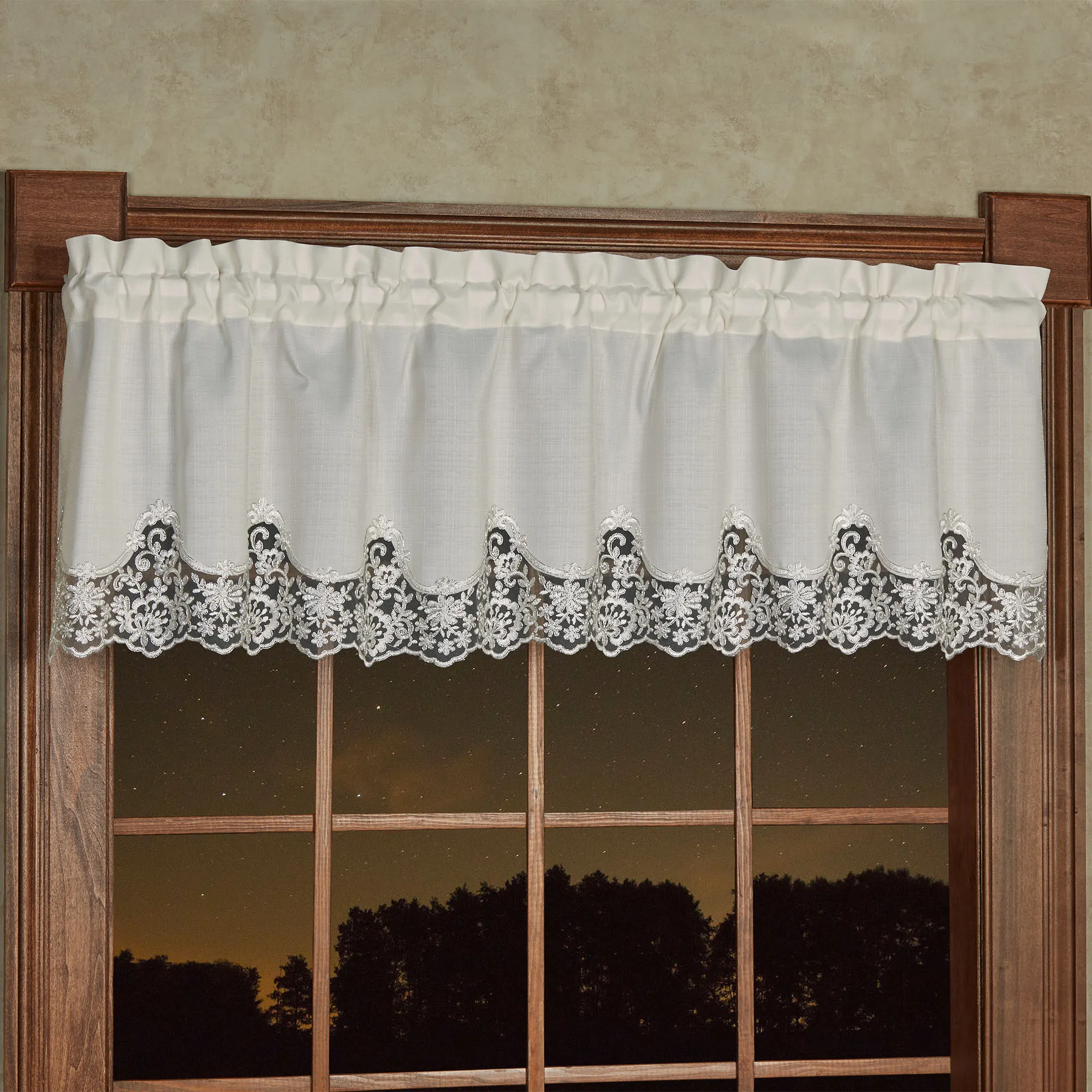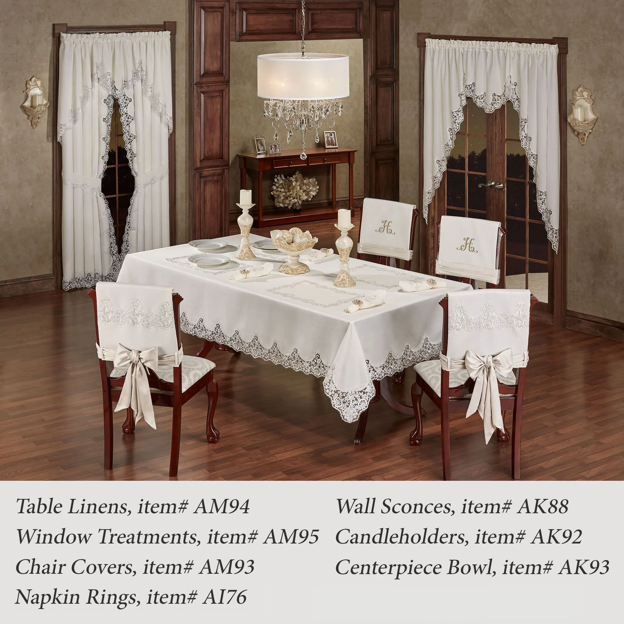 The Evangelina Window Treatment displays lavishly elegant splendor with a signature look. The ivory slubbed polyester window accents have beautifully finished, hand-cut contour edges fancied with silver floral lace. Rod pockets are 1.75". Specify Tailored Valance or Curtain Pair. Tailored Valance is 60"Wx14"L. Curtains include tiebacks and measure 84"W. Machine washable. Imported. The curtain pair width is the total width of two panels together.