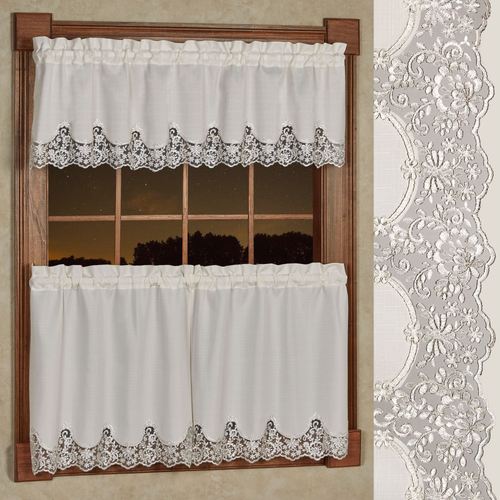 Evangelina Ivory and Silver Lace Trim Window Tier and Valance Set