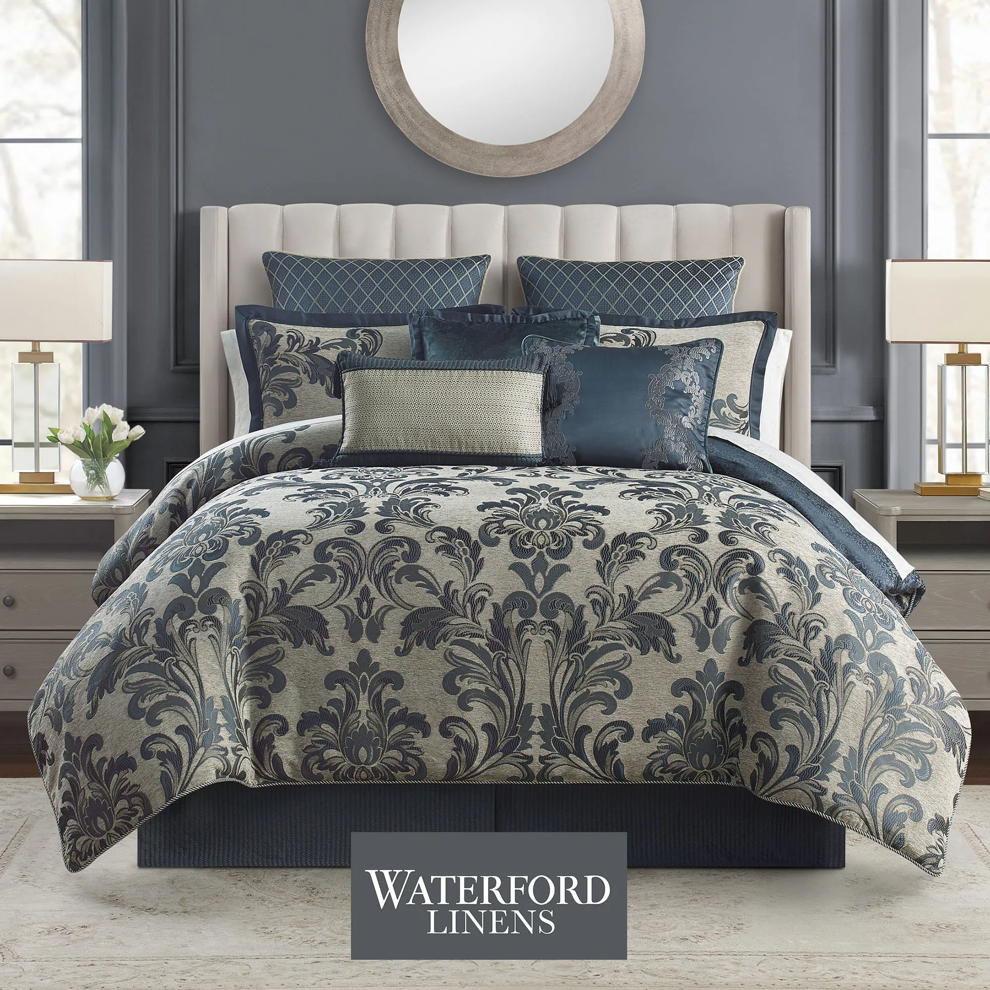 Give your bedroom a grand style with the Everett Comforter Bedding from Waterford(R) Linens. The 6-piece Bed Set includes a comforter, a bedskirt, 2 shams, and 2 European shams. Oversized, polyester comforter features lavish acanthus leaf damask woven in charcoal, dark blue, and midnight hues on parchment-colored chenille. Comforter reverses to dark blue intricate scrollwork on midnight. Click on the Details tab to read about the other items. Bedding fill is polyester. Dry clean only. Imported.