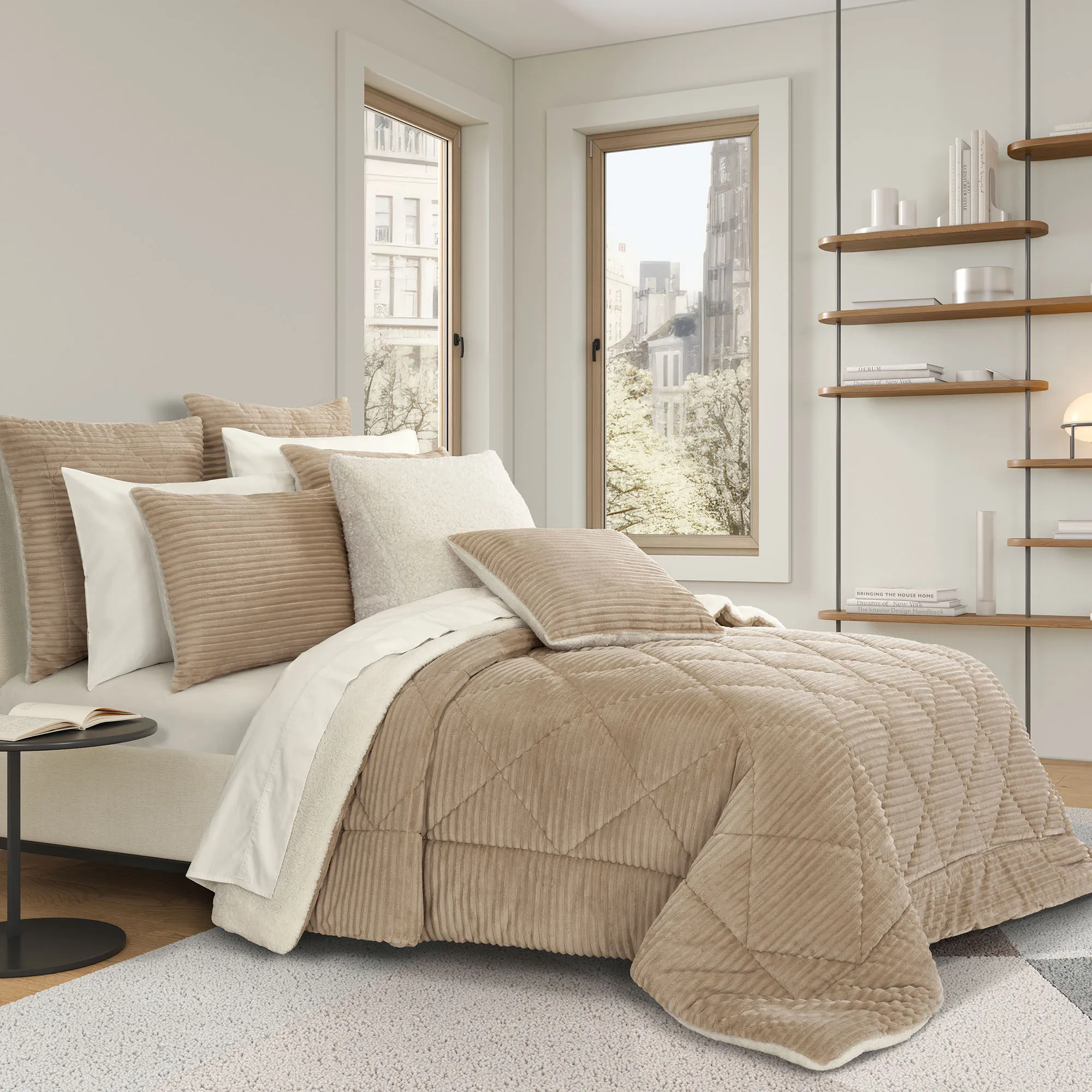 The Comforter Set includes comforter and two shams. Oversized comforter fits mattresses up to 15". Tailored comforter has a fleece ribbed design, diamond quilting, and an ivory sherpa backing. Tailored shams have a fleece ribbed design and zipper closures; shams reverse to ivory sherpa. For comforter set, choose Full/Queen or King/Cal King.