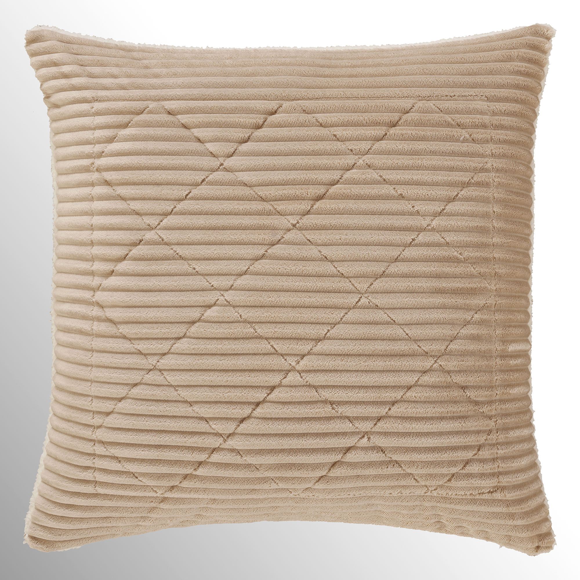 The tailored European Sham has a fleece ribbed design, diamond quilting, and a zipper closure; sham reverses to ivory sherpa.