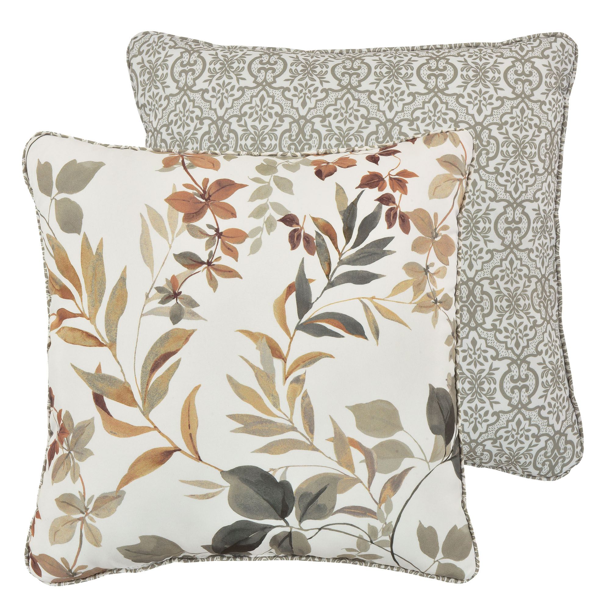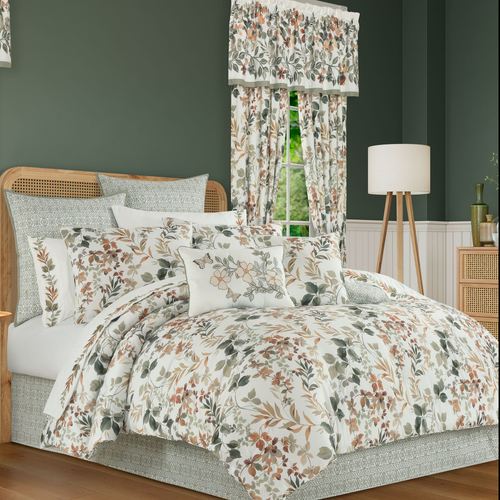 Ensure your dreams are Evergreen when you rest with this lovely Royal Court bedding ensemble. Printed in natural sage, brown, and autumn gold shades, charming botanical leaves vine and flourish against the ivory polyester microfiber ground. A sage leafy medallion latticework reverse adds an intriguing complement.